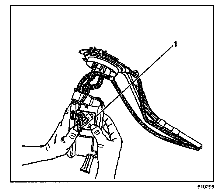 5. Depress the tab on the fuel level sensor (1) while sliding up and out of the housing.