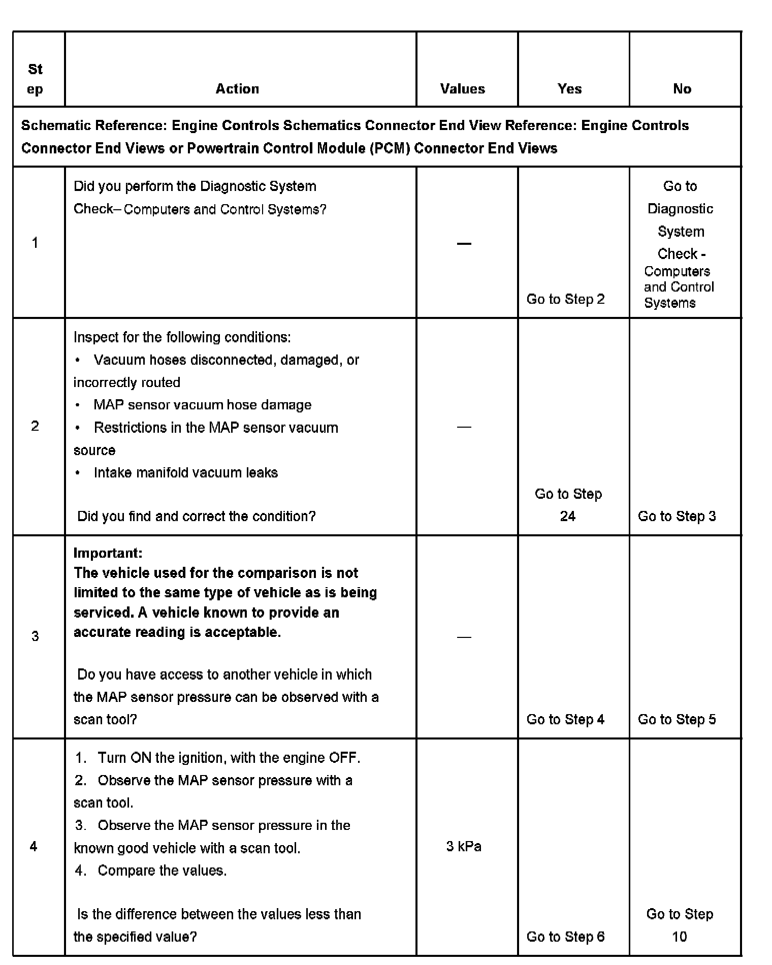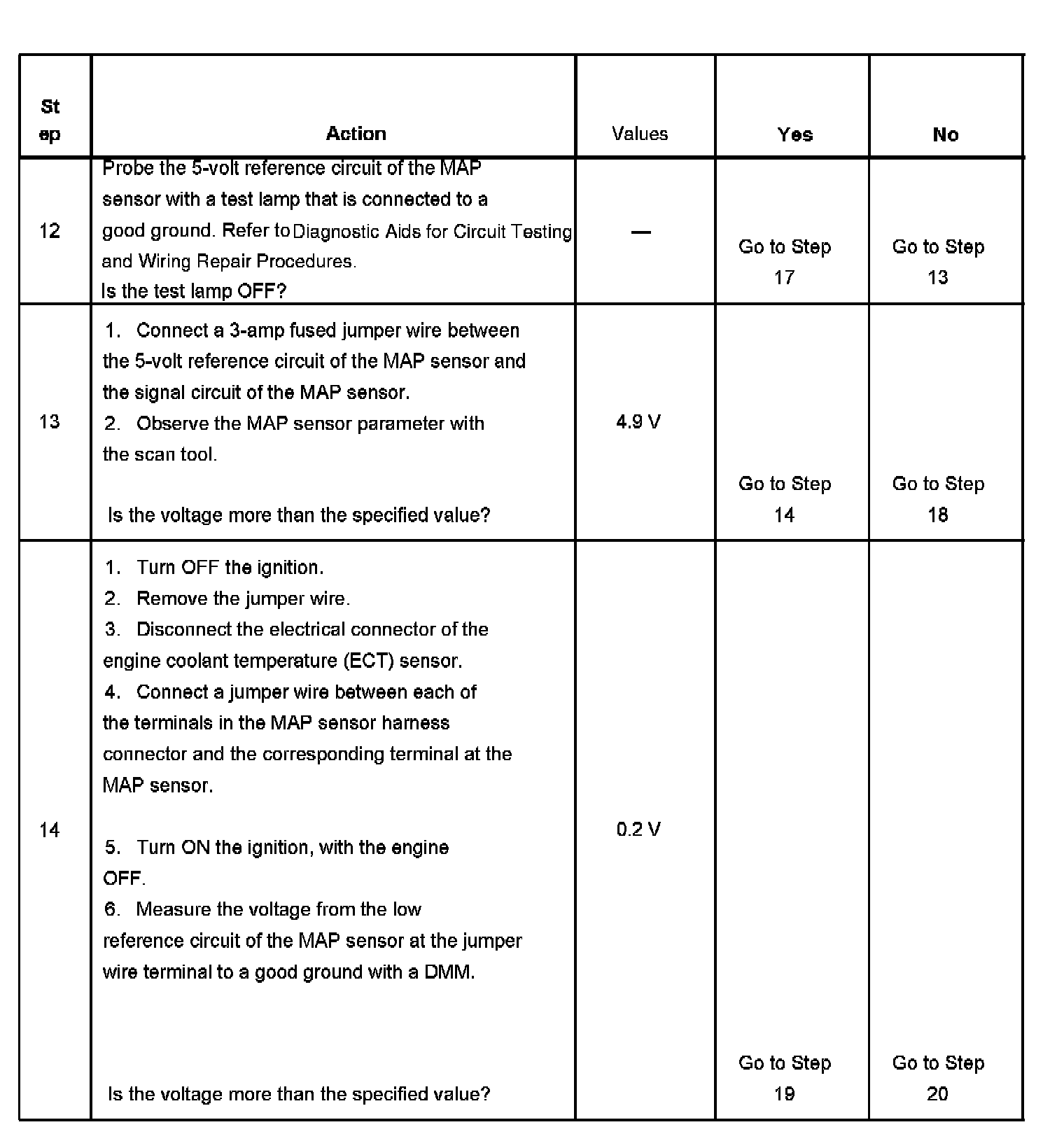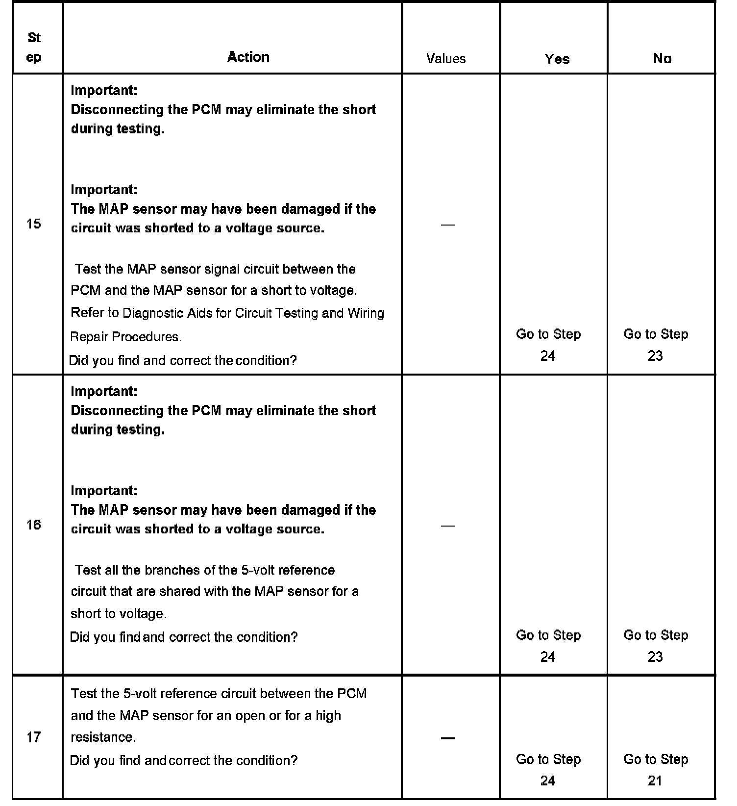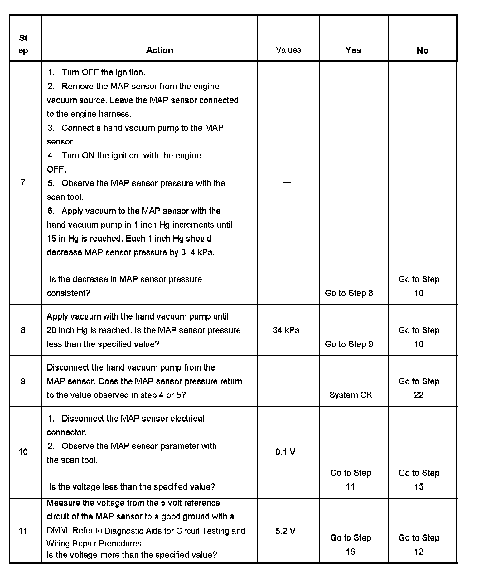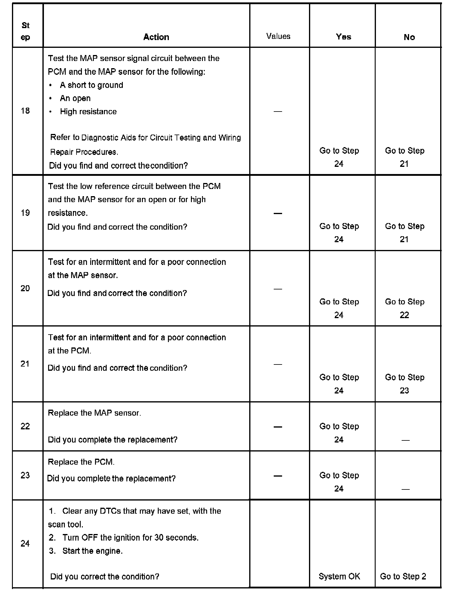 If the PCM detects a MAP sensor signal voltage that is excessively high, DTC P0108 sets. If the PCM detects a MAP sensor signal voltage that is excessively low, DTC P0107 sets