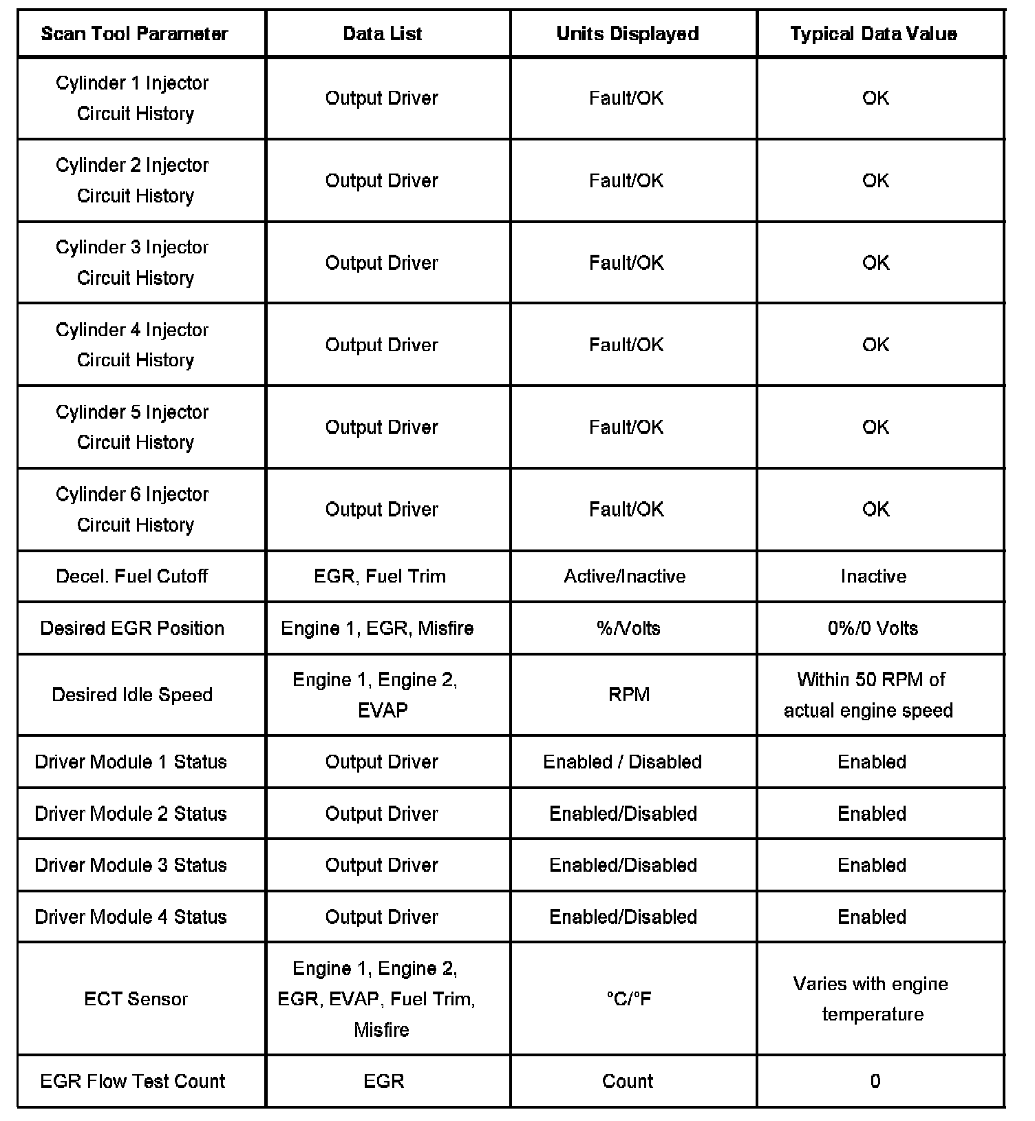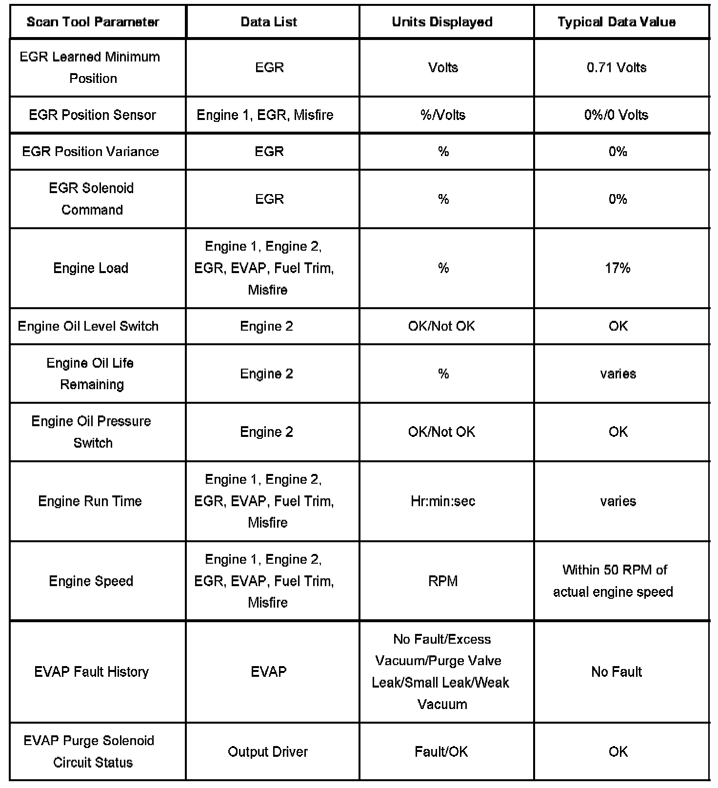 - EGR Data-Contains information specific to the exhaust gas recirculation (EGR) system. This list displays parameters required to verify proper EGR system operation.
