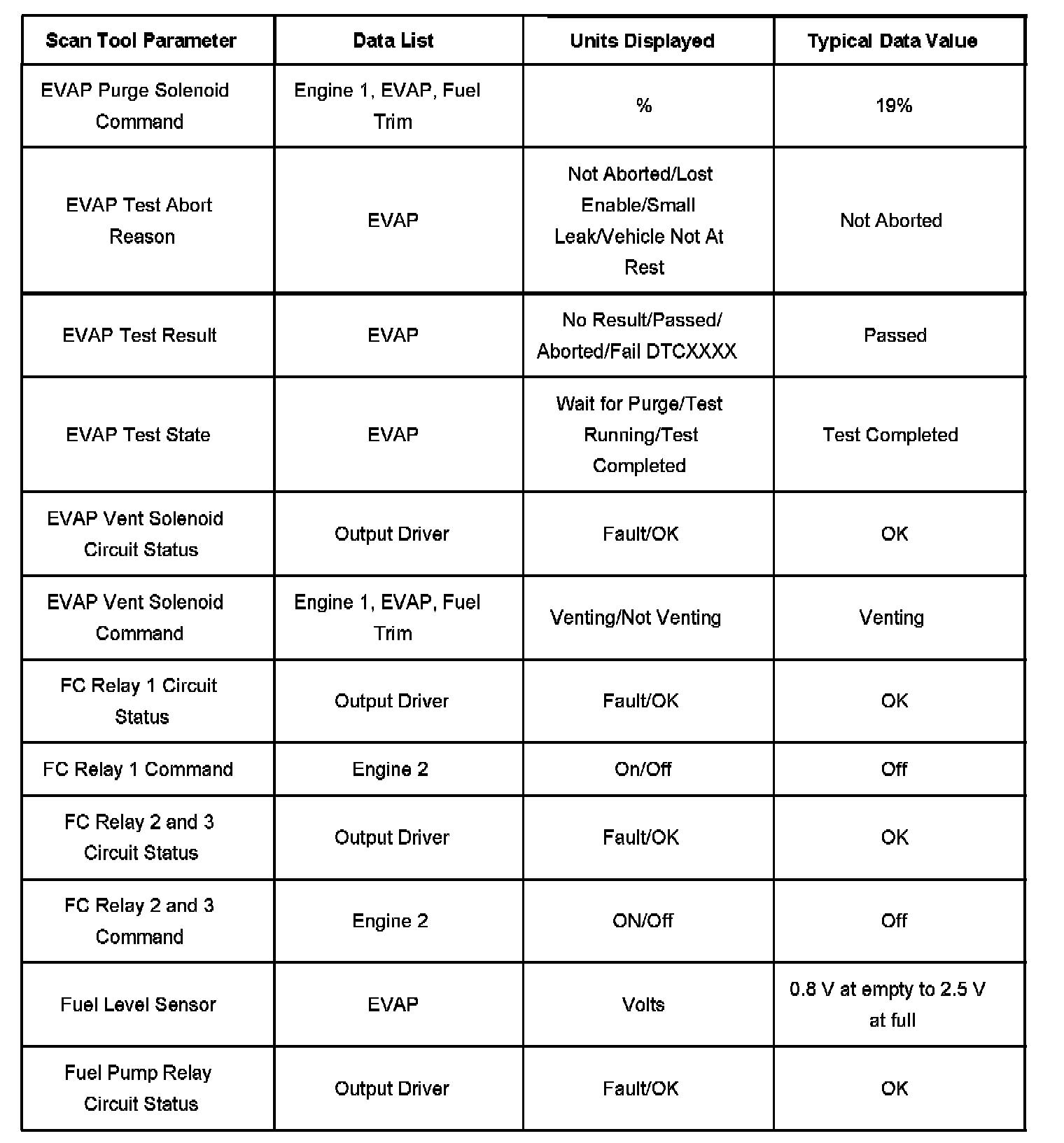 - EVAP Data-Contains information specific to the evaporative emissions (EVAP) control system. Also displays parameters required to verify proper EVAP system operation.