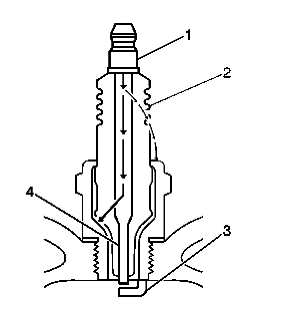 - Inspect for signs of tracking that occurred near the insulator tip instead of the center electrode (4).