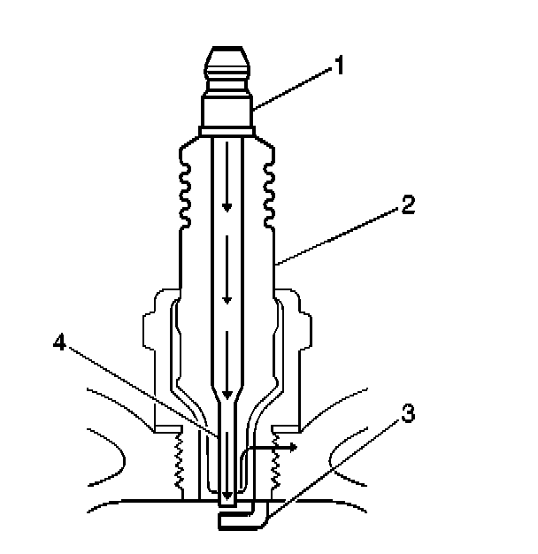 - Inspect the insulator (2) for cracks. All or part of the electrical charge may arc through the crack instead of the electrodes (3, 4).
