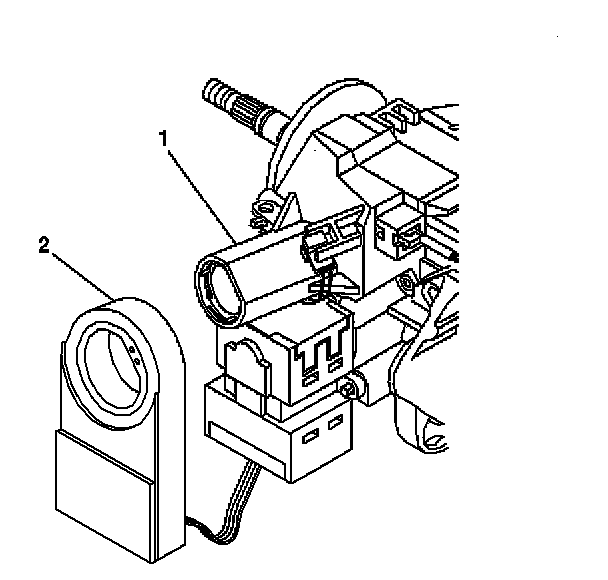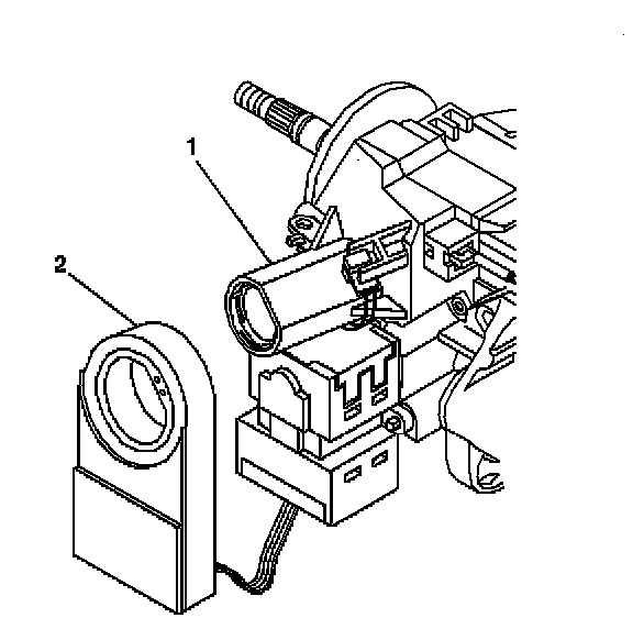 1. Install the theft deterrent control module (2) onto the ignition lock cylinder case assembly (1).