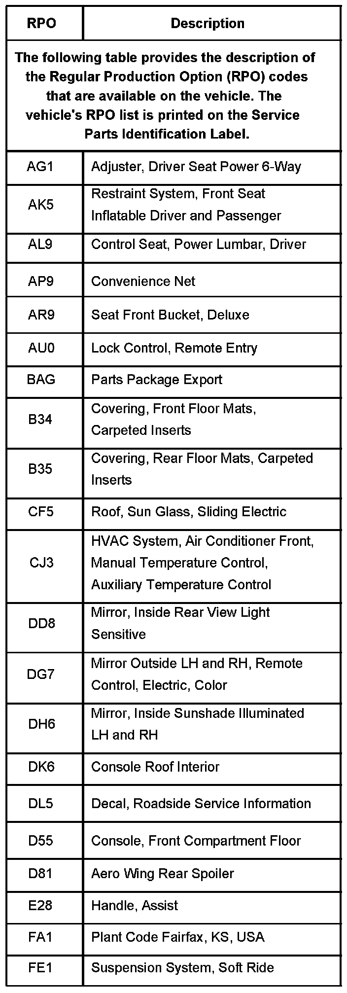 RPO Code List Part 1: