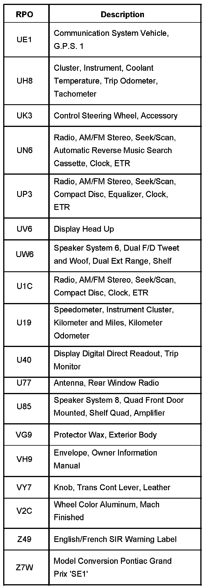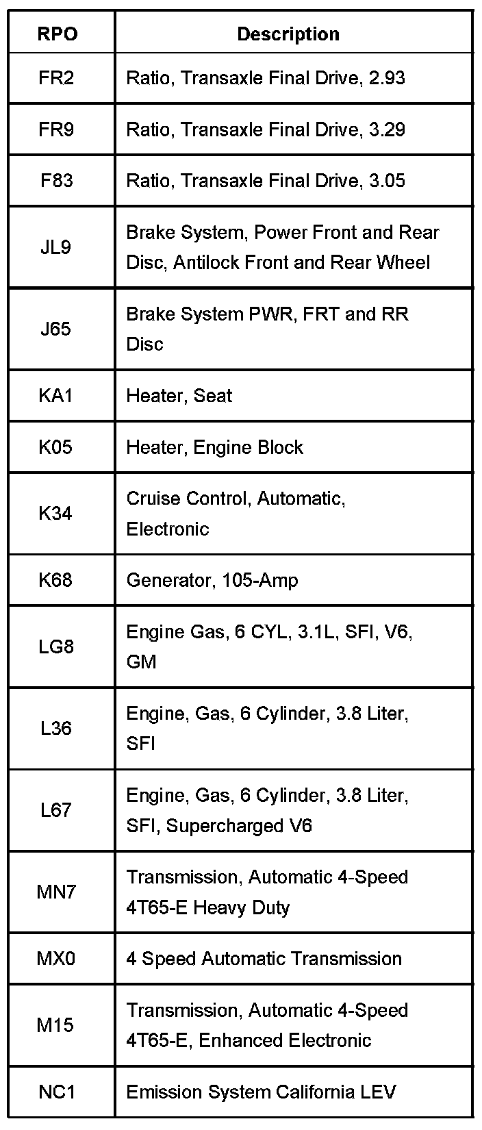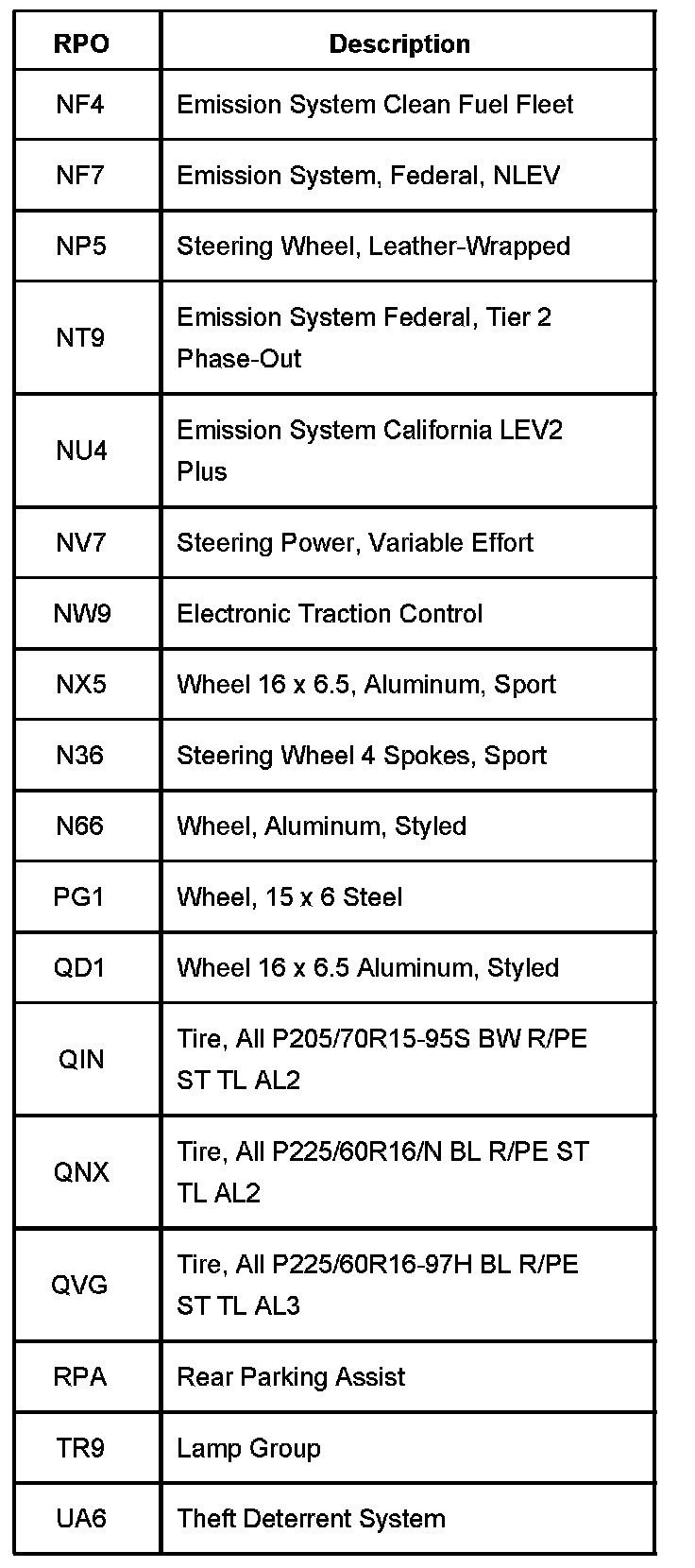 RPO Code List