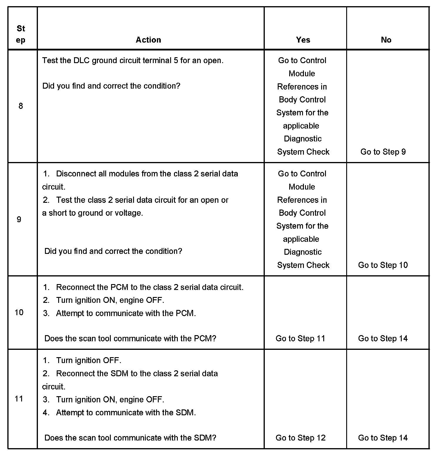 9. An open in the class 2 serial data circuit between the DLC and the modules will prevent the scan tool from communicating with any module. This condition will not set a DTC. The class 2 serial data circuit is shorted to voltage or ground. The condition may be due to the wiring or due to a malfunction in one of the modules. When testing the wiring for a short, make sure there is not a module connected to the wire being tested. This test isolates the PCM class 2 serial data circuit.