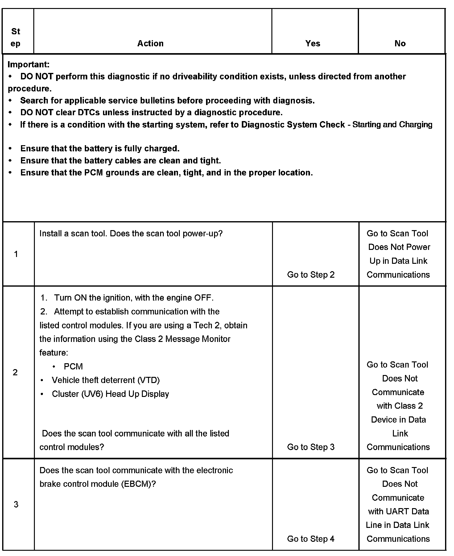 2. Lack of communication may be due to a partial malfunction of the class 2 or UART serial data circuit or due to a total malfunction of the class 2 or UART serial data circuit. The specified procedure determines the particular condition.