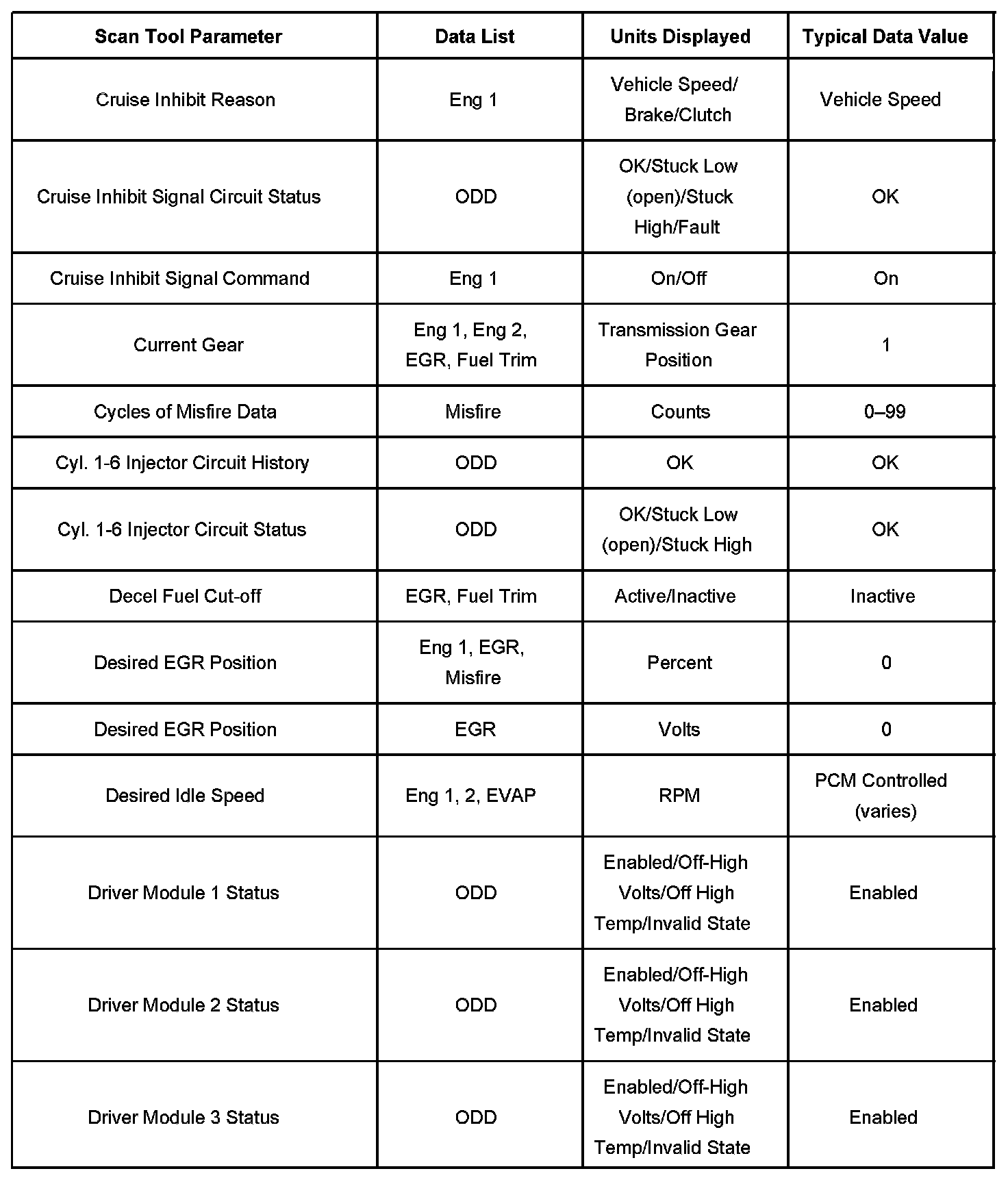 Only the parameters listed are referenced for use in diagnosis. If all values are within the typical range described below, refer to Symptoms - Computers and Control Systems for diagnosis. Symptom Related Diagnostic Procedures