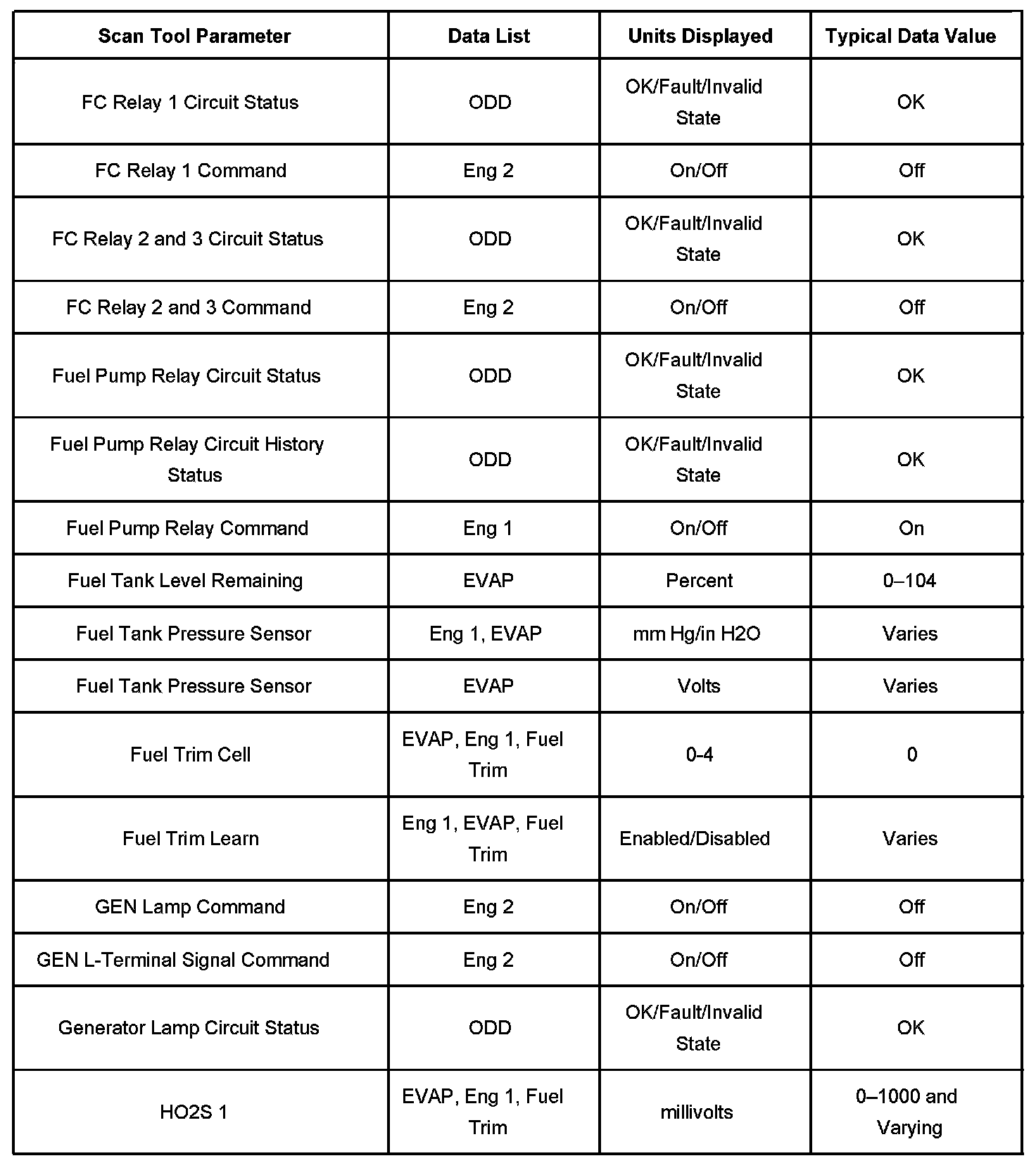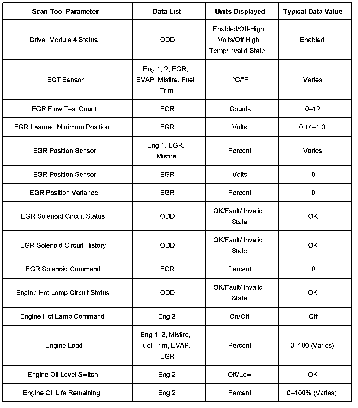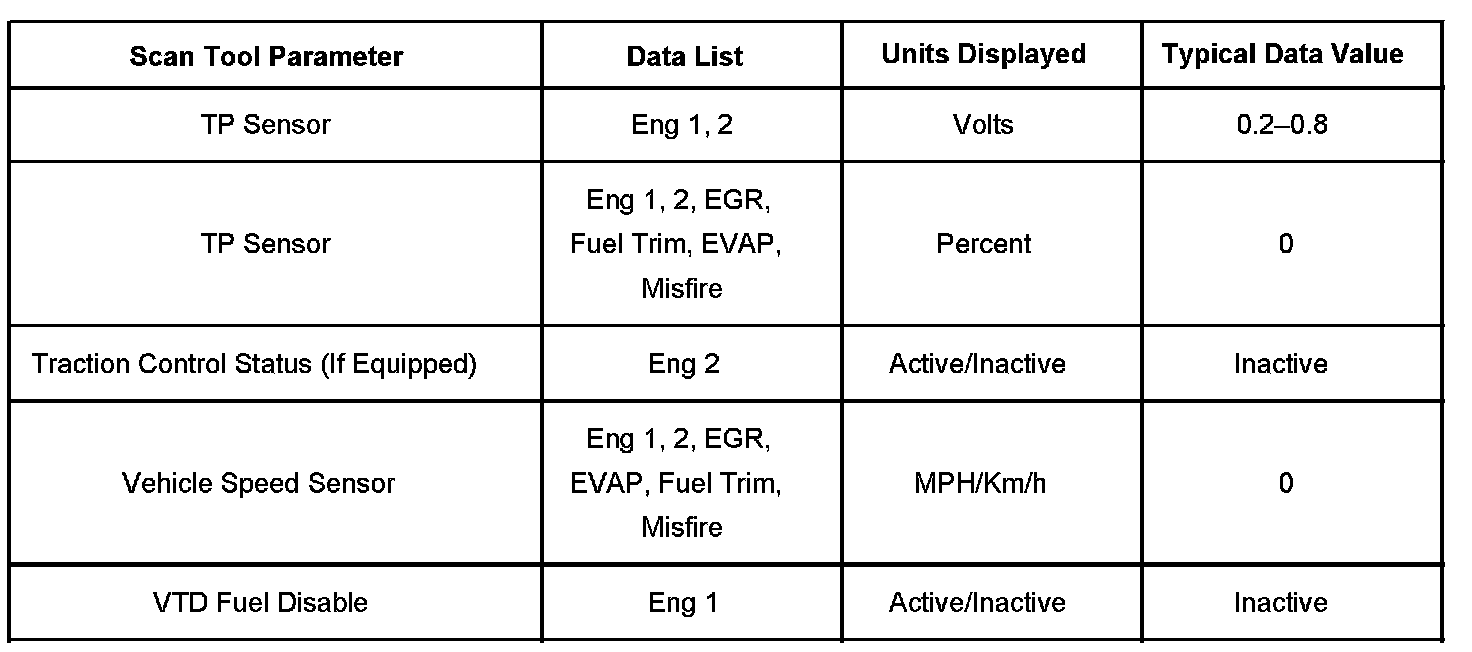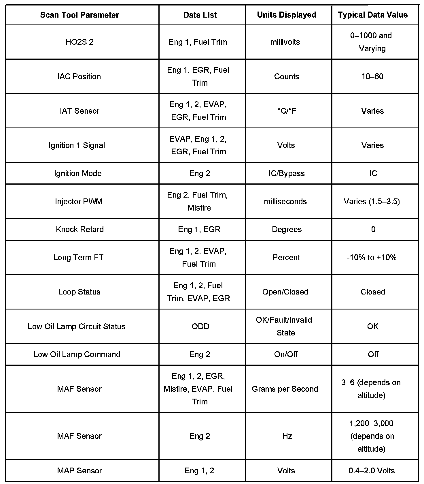 The Engine Scan Tool Data List contains all engine-related parameters that are available on the scan tool. The list is arranged in alphabetical order. A given parameter may appear in any one of the data lists, and in some cases may appear more than once, or in more than one data list in order to group certain related parameters together.