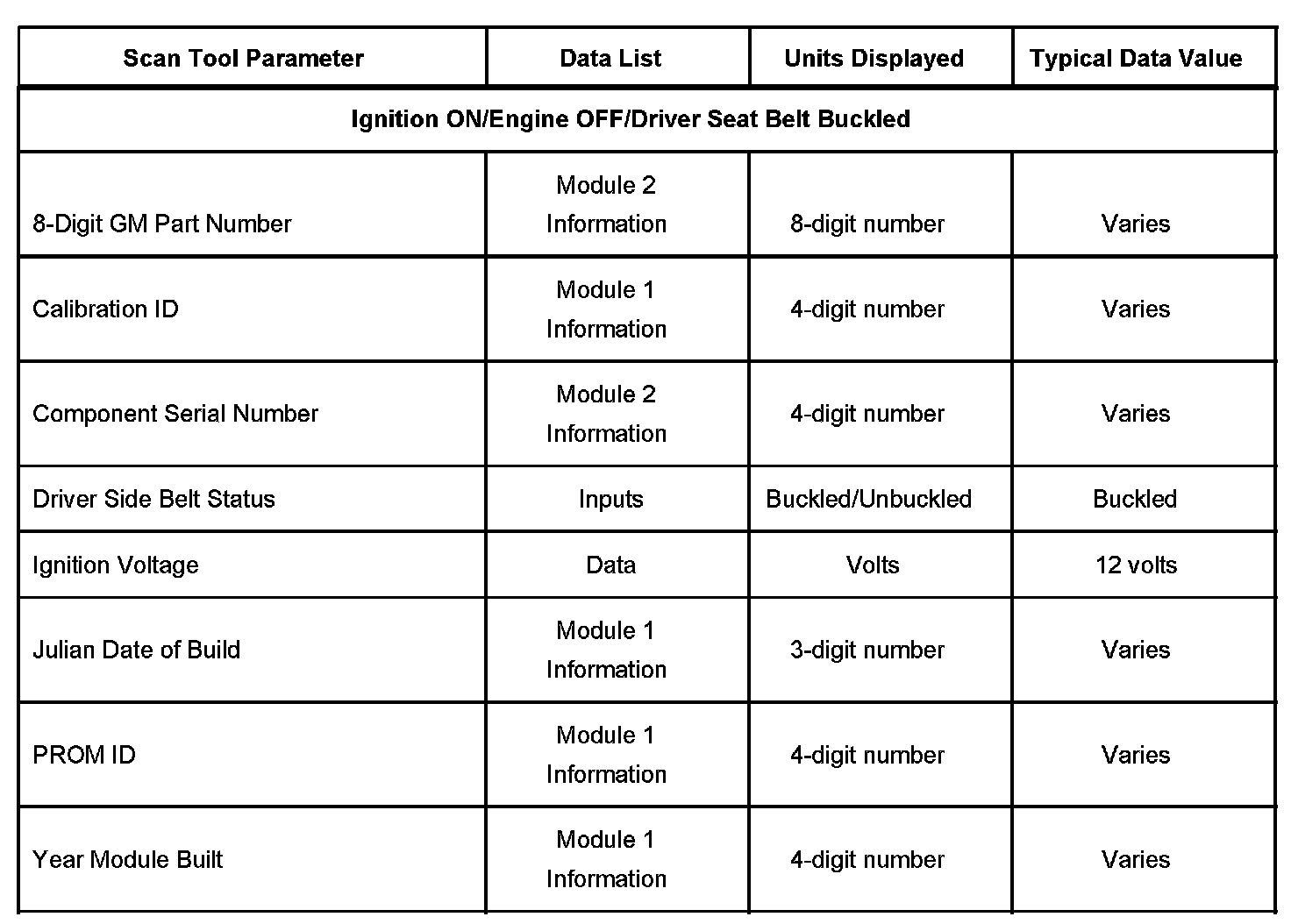 The SIR scan tool data list contains all the restraint system related parameters that are available on the scan tool. The parameters in the list are arranged in alphabetical order. The column, "Data List," indicates the location of the parameter within the scan tool menu selections.