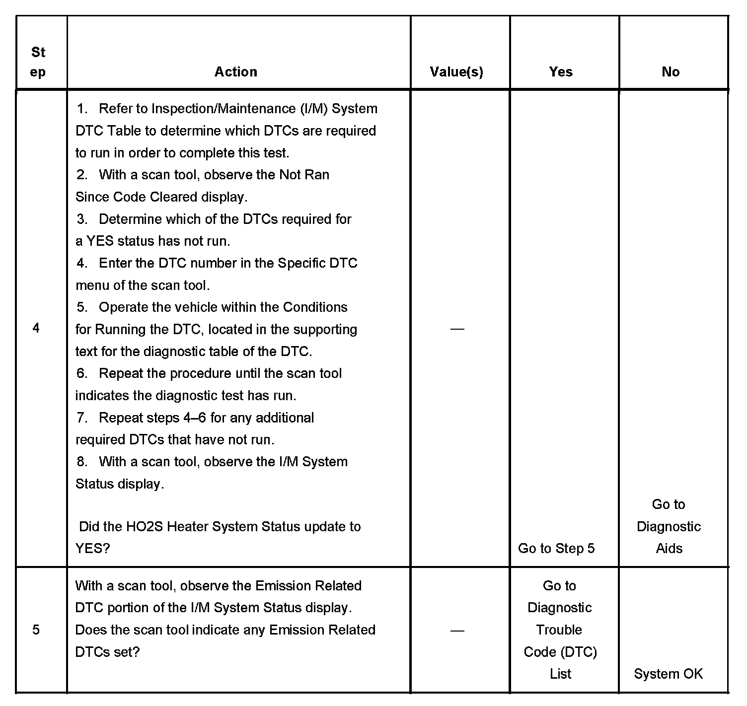 3. This step is to identify a first failure of a type B DTC. A DTC only appears on the I/M System Status display when the DTC becomes a MIL illuminating DTC. This occurs on the second failure of a type B DTC. A first failure of a type B DTC will not allow the I/M System Status to update to YES. Refer to Diagnostic Aids.
