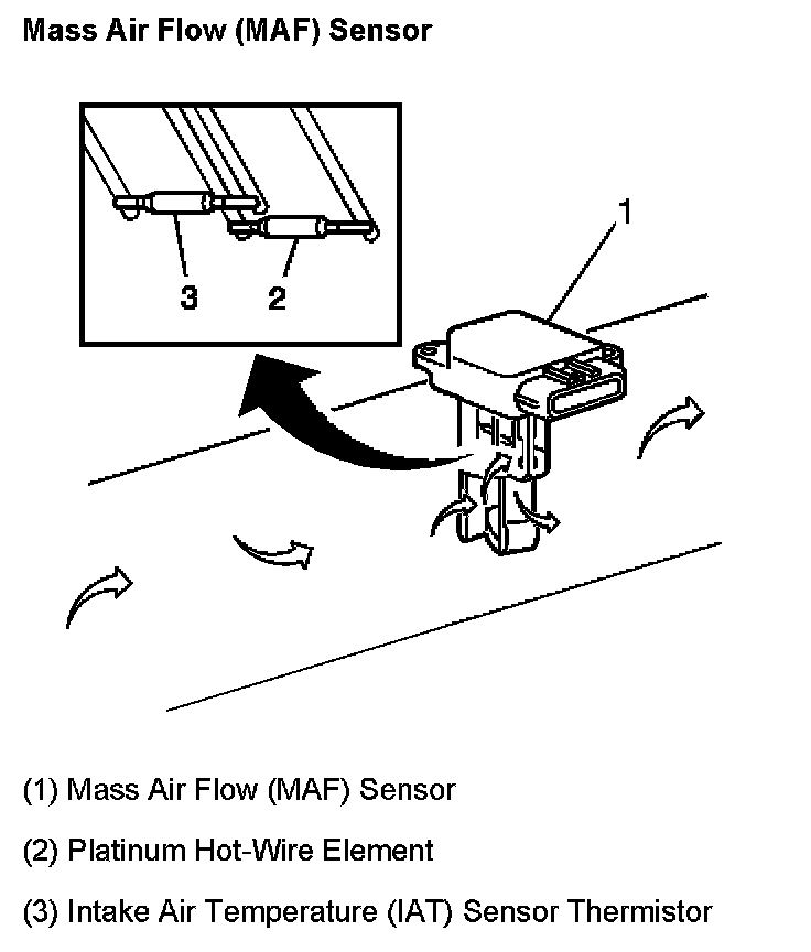 The MAF sensor is a hot-wire design. A platinum hot-wire (2) and a thermistor (3) are located in the intake air bypass passage of the MAF sensor housing. The temperature of the platinum hot-wire is affected by exposure to air flow and by exposure to air temperature. The platinum hot-wire is maintained at a set temperature by controlling the current flow through the wire. The MAF sensor converts the changes in current flow to a voltage signal. The voltage signal from the MAF sensor enables the PCM to detect changes in the air density and changes in air volume.