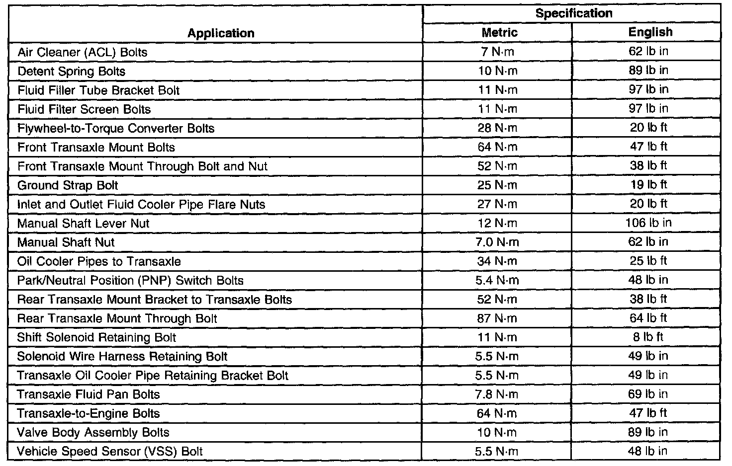 Fastener Tightening Specifications: