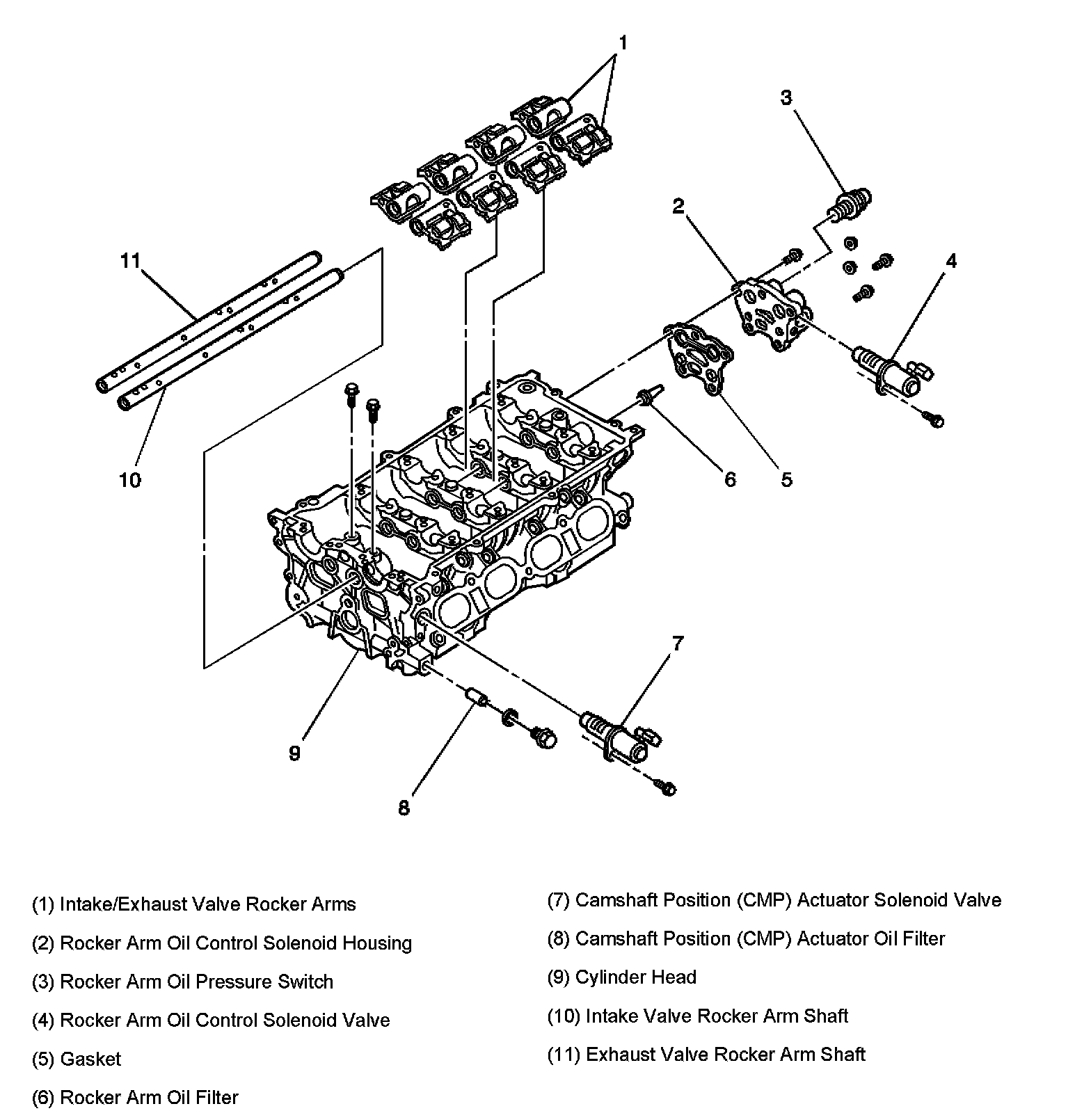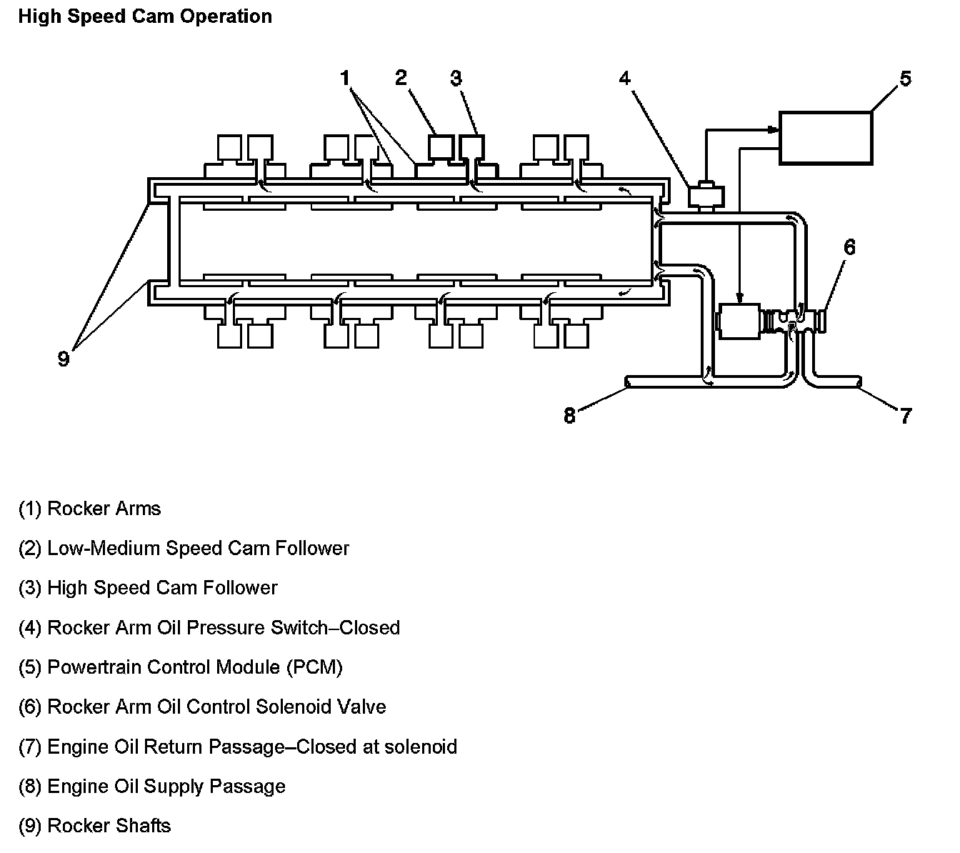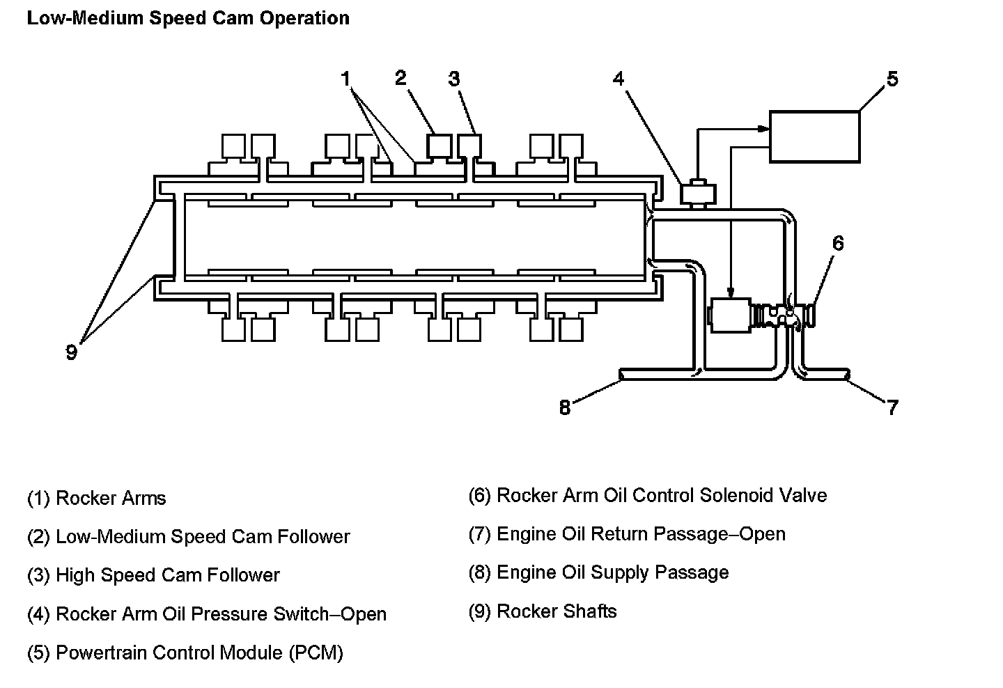 During engine operation below 6,000 RPM, the rocker arms (8) follow the low/medium speed cam lobes (4). When engine oil is allowed to flow unobstructed to the rocker arms, the arms follow the high speed cam lobes (3), increasing valve lift. The flow of engine oil to the rocker arms is controlled by the rocker arm oil control solenoid valve. The solenoid is pulse width modulated (PWM) by the powertrain control module (PCM). The rocker arm oil pressure switch detects oil pressure when the rocker arm oil control solenoid is ON. The oil pressure switch input enables the PCM to monitor the operation of the rocker arm oil control solenoid. The rocker arm oil filter removes dirt and debris from the supply of engine oil to the rocker arm shafts.