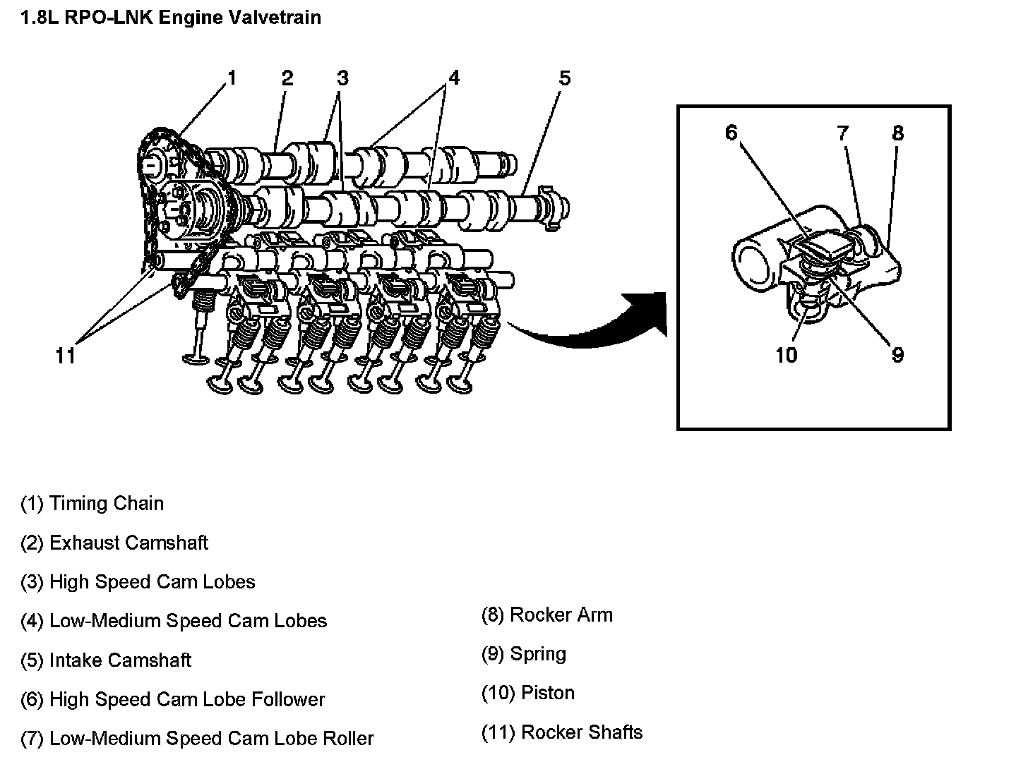 The high output 1.8L RPO-LNK engine has a high speed cam system that increases engine output between 6,000-8,200 RPM. The increase in power is possible because valve lift is significantly increased at engine speeds above 6,000 RPM. A second camshaft lobe with a high lift profile is cast into each camshaft, alongside the low/medium speed lobes. In order to use the high speed cam only when desired, the engine utilizes a rocker arm oil control system. The system uses unique rocker arms that are hydraulically operated and electronically controlled.The rocker arms (1) ride on rocker arm shafts (10, 11) that supply engine oil, that is under pressure, to the rocker arms. The flow of engine oil to the rocker arms and shafts is controlled by the rocker arm oil control solenoid valve (4). A rocker arm oil pressure switch (3) signals the PCM when oil pressure is detected. A screen type oil filter (6) is located in the oil supply passage to the rocker arm shafts. The rocker arm oil control solenoid (4) and the oil pressure switch (3) are located in the oil control housing (2).