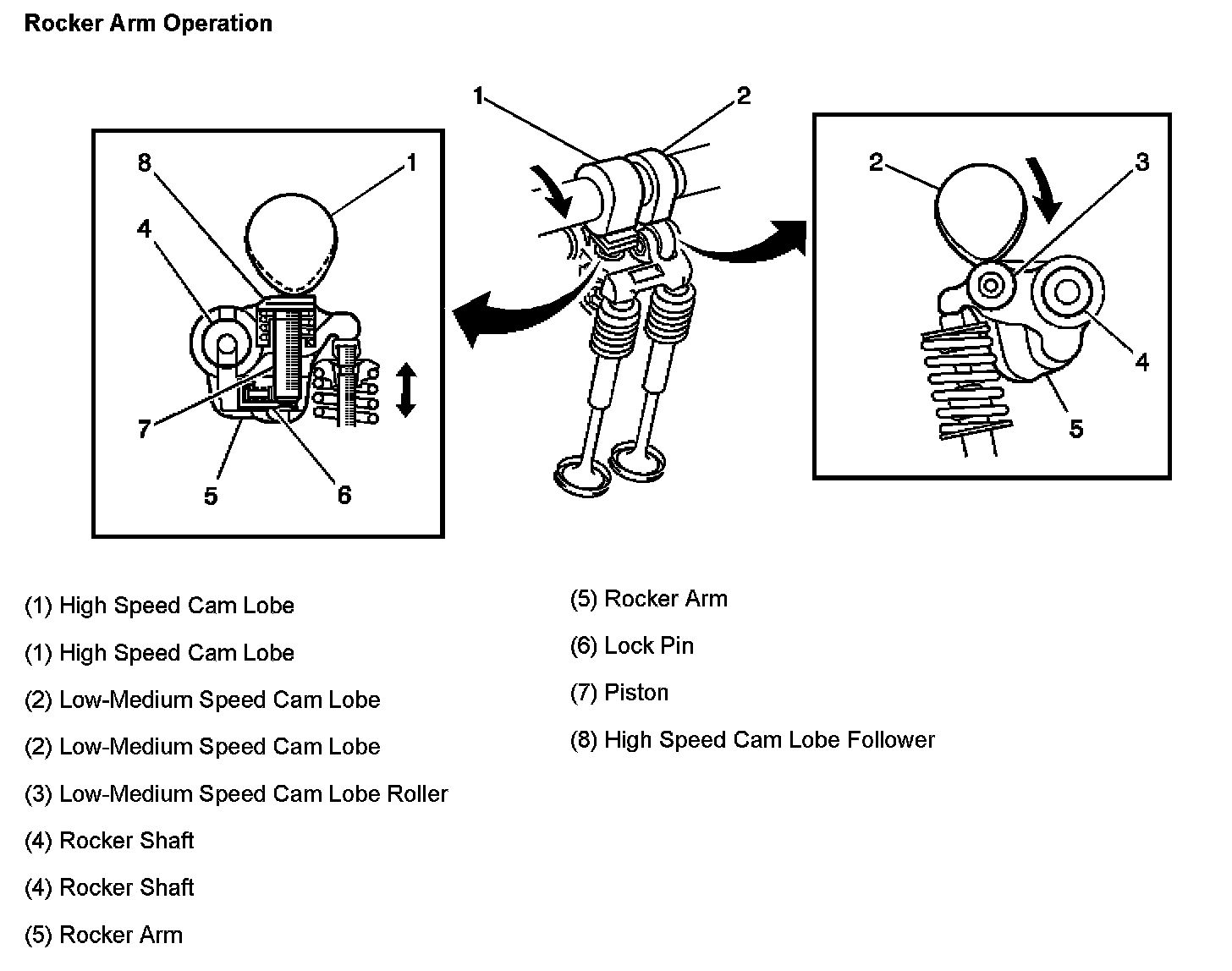 Each rocker arm opens and closes both intake or exhaust valves simultaneously. The rocker arms also follow both the low/medium speed camshaft lobes (2) and high speed camshaft lobes (1) at all times. The low/medium speed cam lobe (2) rides on a hardened steel roller (3). The high speed cam lobe (1) rides on a steel pad follower (8). The steel pad (8) sits on top of a piston (7) that is normally supported by a spring and is free to move up and down against the cam lobe (1). Because the follower piston spring is weaker than the valve springs, the cam follower (8) moves away from the cam lobe (1) instead of the rocker arm (5). Therefore, with no oil pressure applied to the rocker arm, the low/medium speed cam lobe (2) opens and closes the valves.