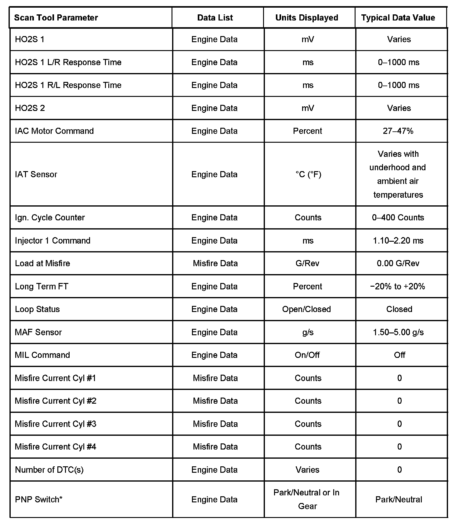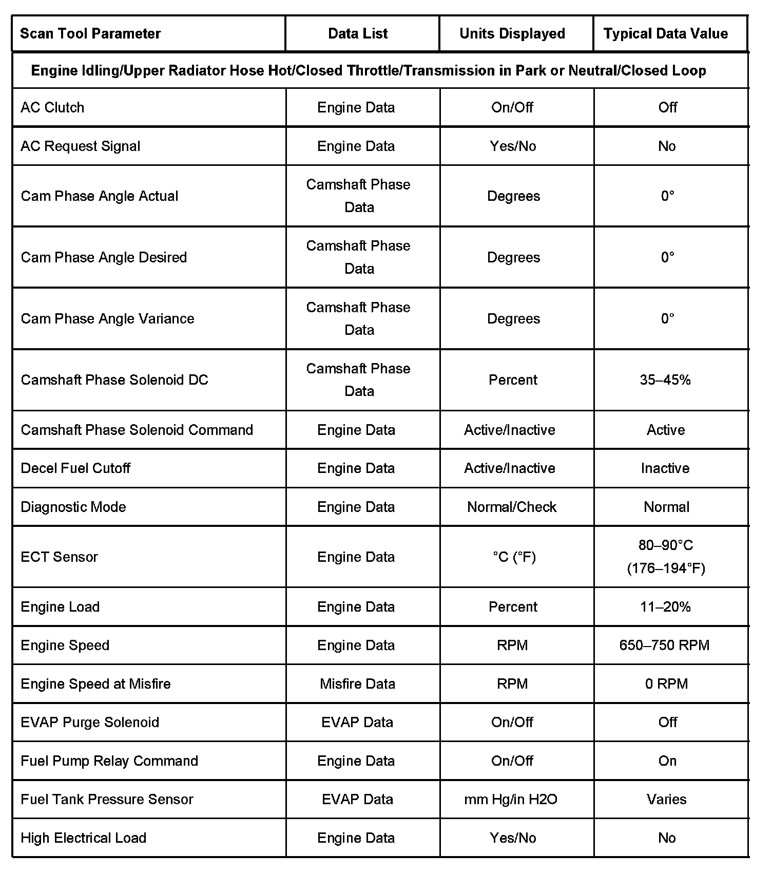 Scan tool values from a properly running engine may be used for comparison with the engine you are diagnosing. The Engine Scan Tool Data List represents values that would be seen on a normally running engine.