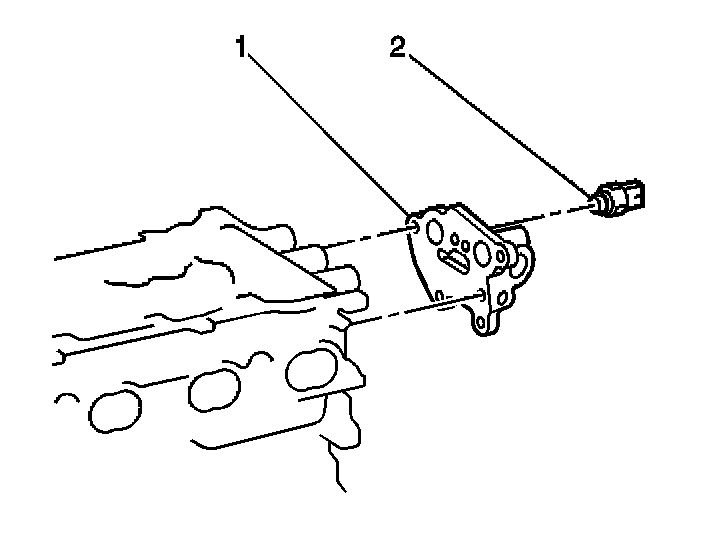 1. Install the the rocker arm oil pressure switch (2) into the rocker arm oil control solenoid housing (1).