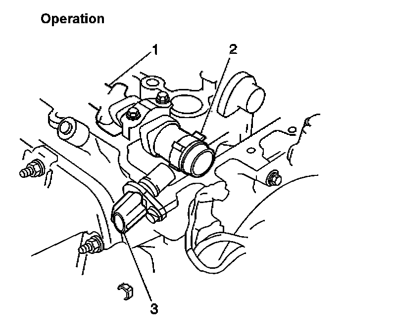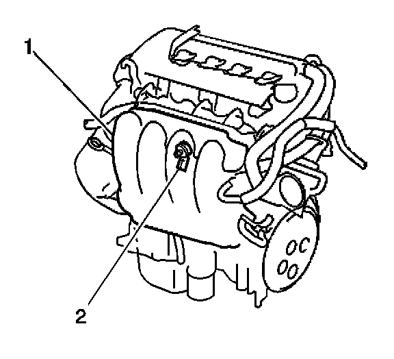 The knock sensor (KS) (1) is located below the intake manifold (2), on the engine block between cylinder 2 and cylinder 3. The KS detects engine detonation and sends a signal to the PCM. The PCM uses the input from the KS to adjust the ignition timing in order to control detonation. For detailed information on the operation of the KS refer to Knock Sensor (KS) System Description.