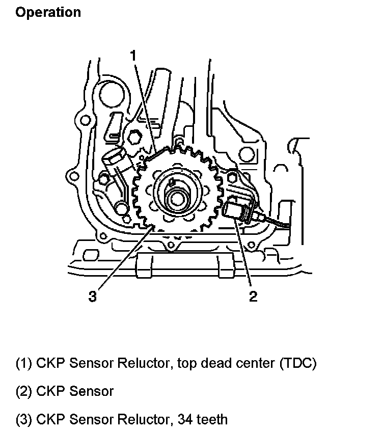 The CKP sensor reluctor (3) has 34 teeth and is mounted on the crankshaft behind the timing chain cover and the crankshaft pulley. When the crankshaft rotates, the CKP sensor signal rotor teeth pass by the CKP sensor (2) causing a fluctuation in the sensors magnetic field. The fluctuation in the magnetic field induces a voltage in the CKP sensor circuitry that corresponds to every 10 degrees of crankshaft rotation. The reluctor has one wide tooth (1) that indicates top dead center (TDC) of the number 1 cylinder. With the information that the PCM receives from the CKP sensor, the PCM determines engine speed and crankshaft position.