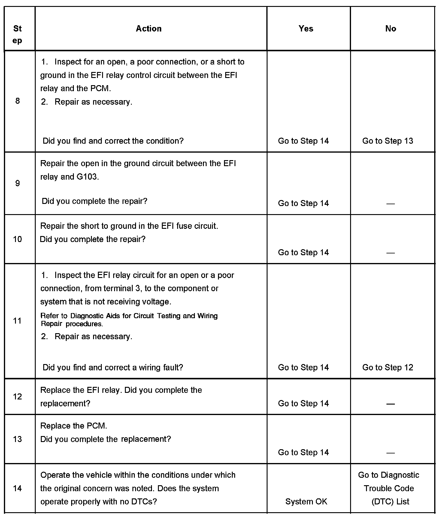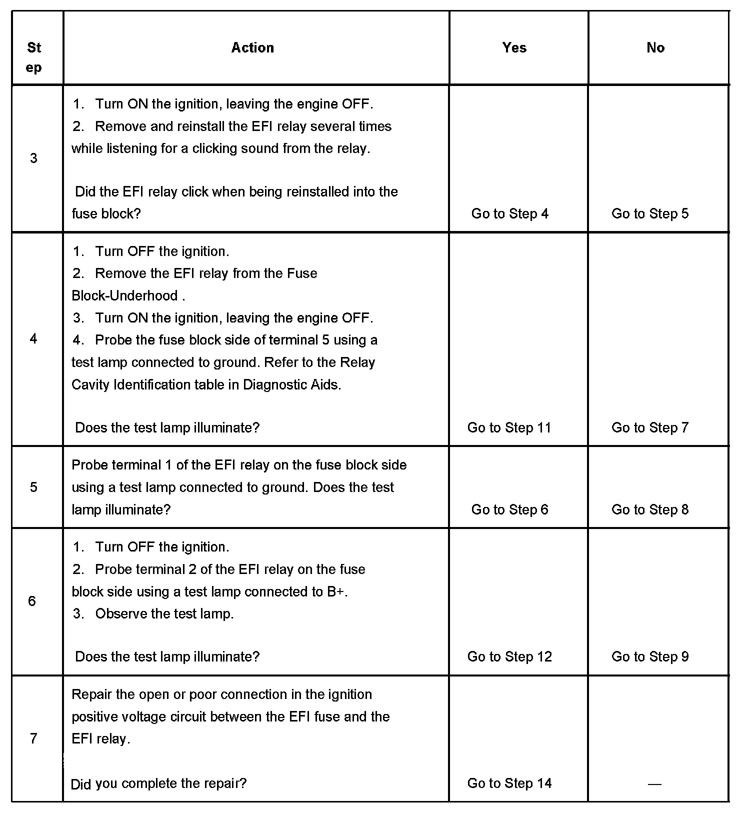 The numbers below refer to the step numbers on the diagnostic table.