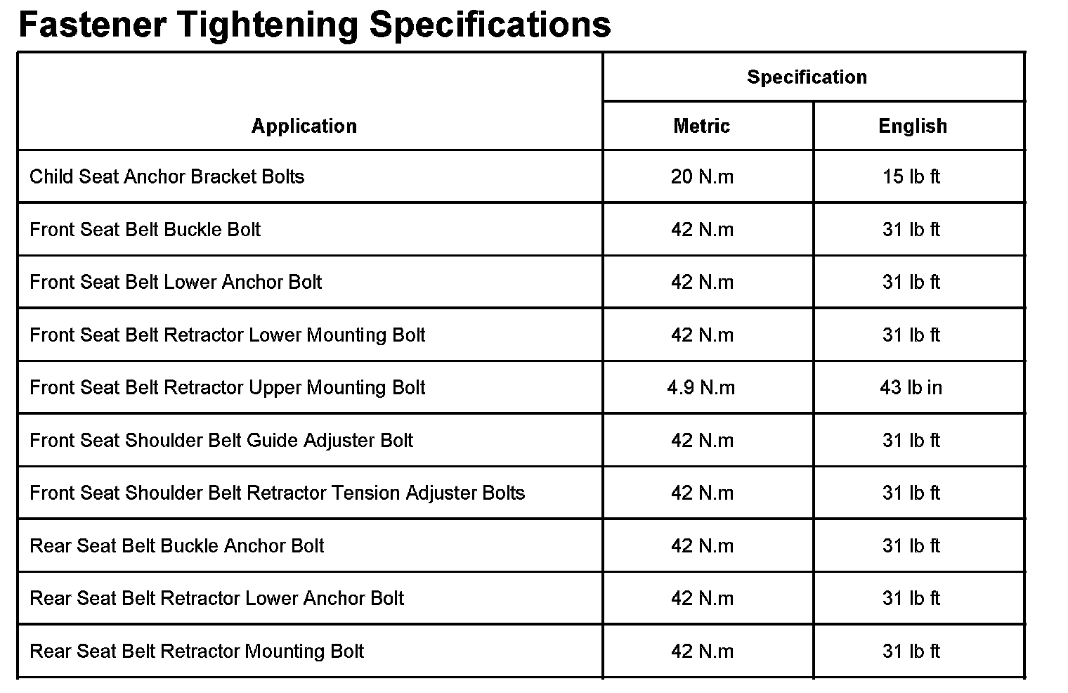 Fastener Tightening Specifications:
