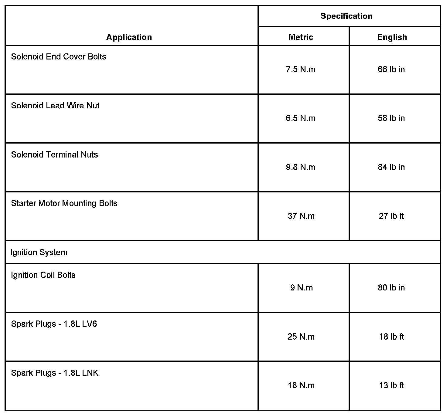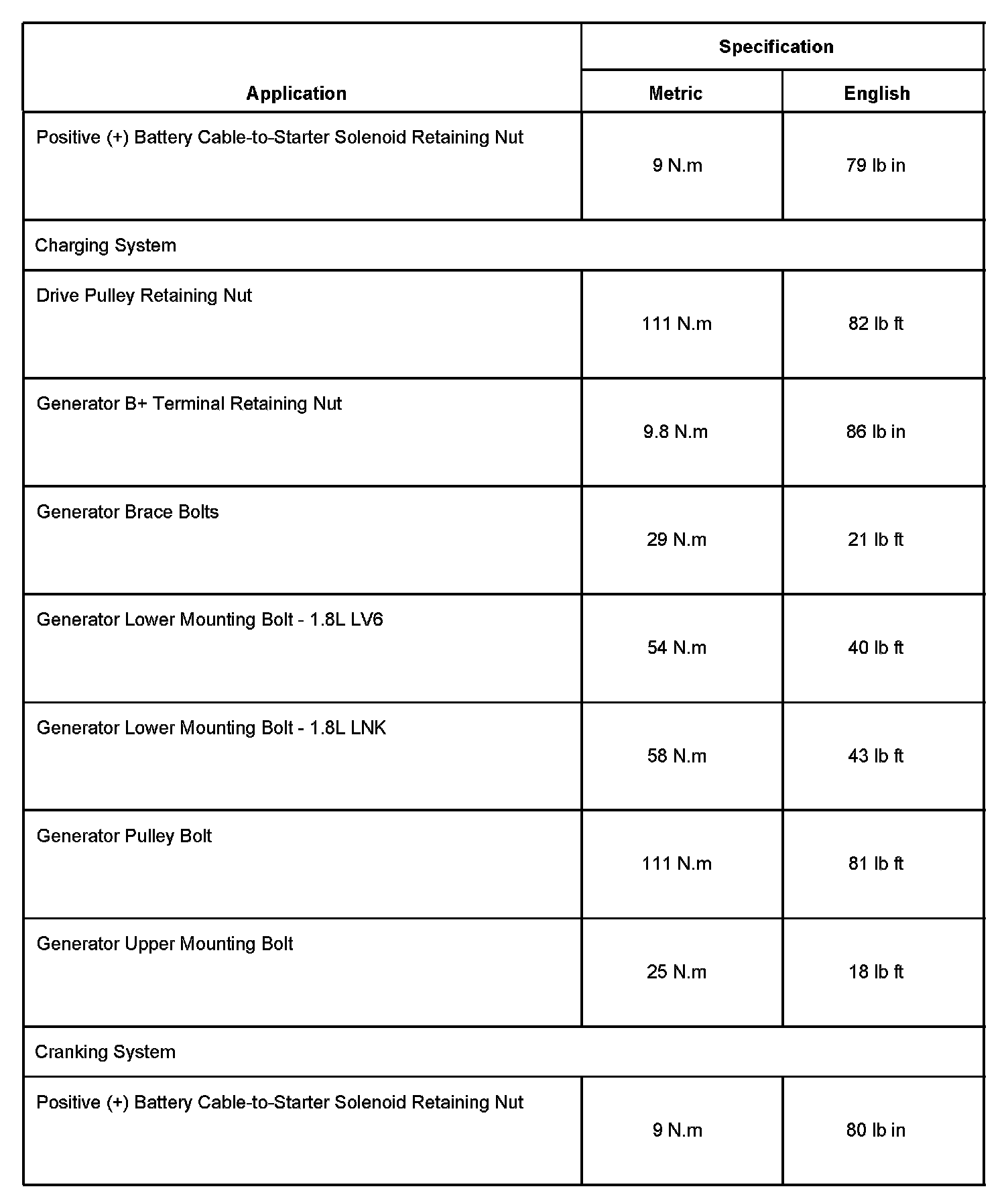Starting and Charging: Specifications