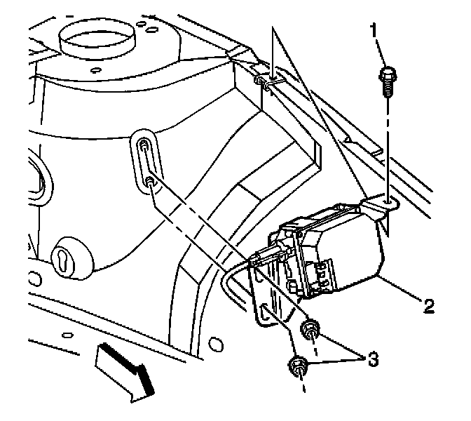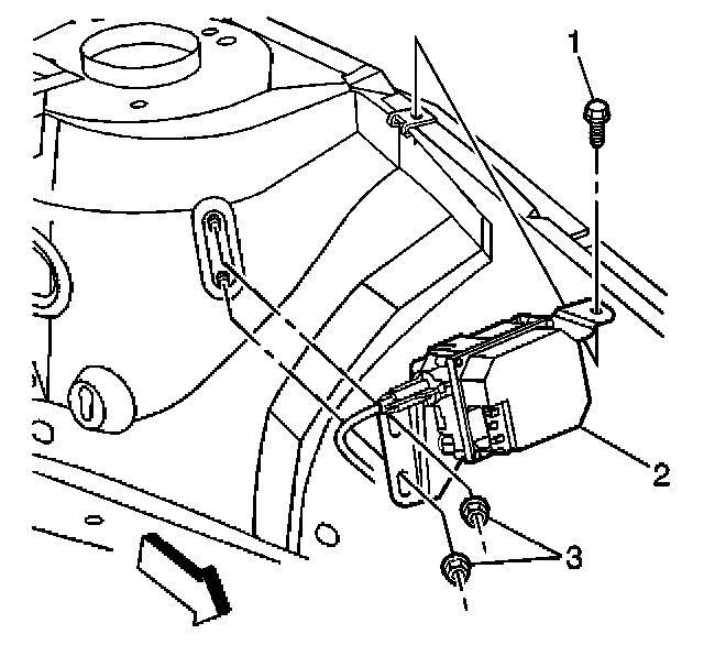 3. Remove the cruise control module bracket retaining fasteners (1, 3).