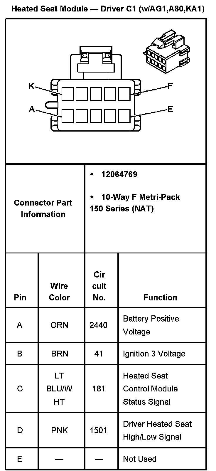 Heated Seat Module - Driver C1 (With RPO Codes AG1,A80,KA1) Part 1:
