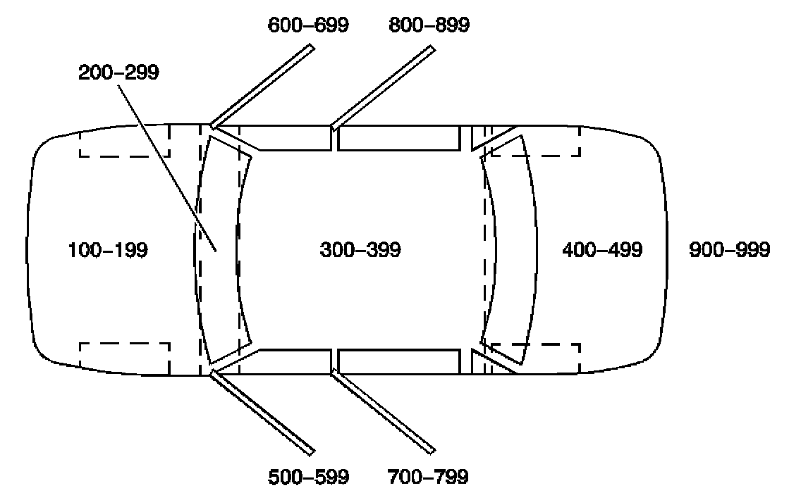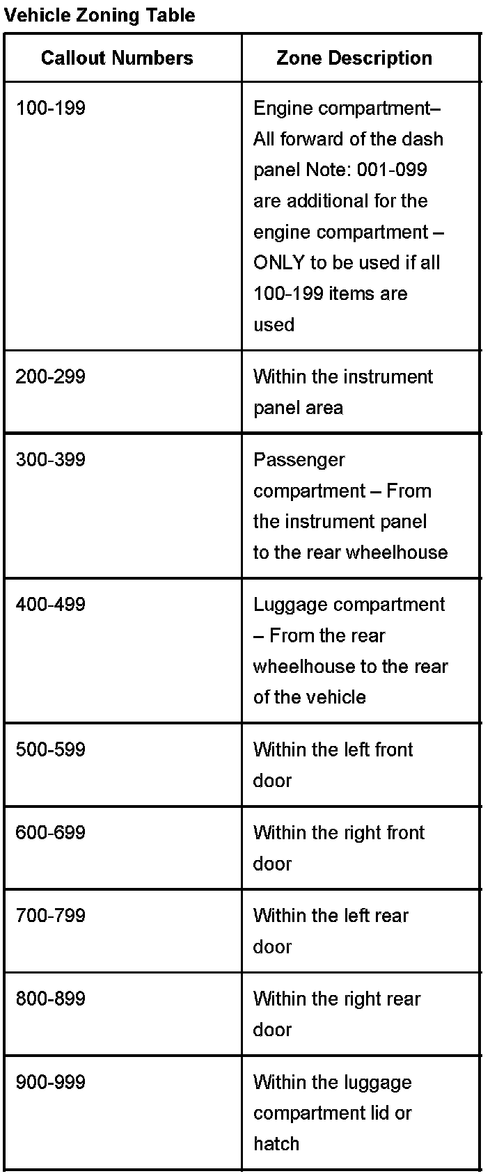 All grounds, in-line connectors, pass-through grommets, and splices have identifying numbers that corresponds to where they are located in the vehicle. The table explains the numbering system.