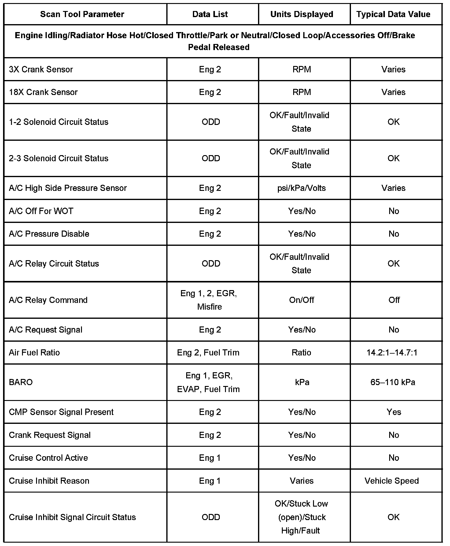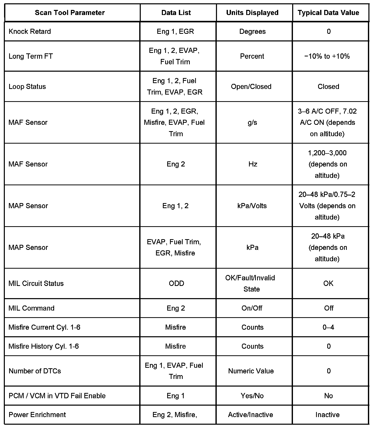The Engine Scan Tool Data List contains all engine related parameters that are available on the scan tool. The list is arranged in alphabetical order. A given parameter may appear in any one of the data lists, and in some cases may appear more than once, or in more than one data list in order to group certain related parameters together.