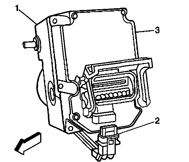 9. Remove the brake pressure modulator valve (BPMV) electrical connector (2) from the EBCM (3).