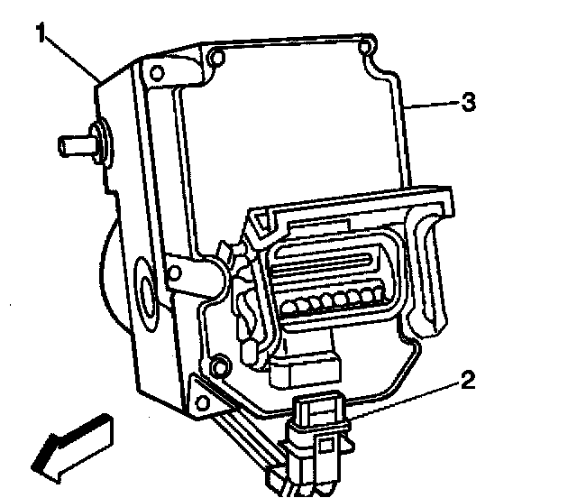 7. Rotate the EBCM connector tab (2) down to the locked position.