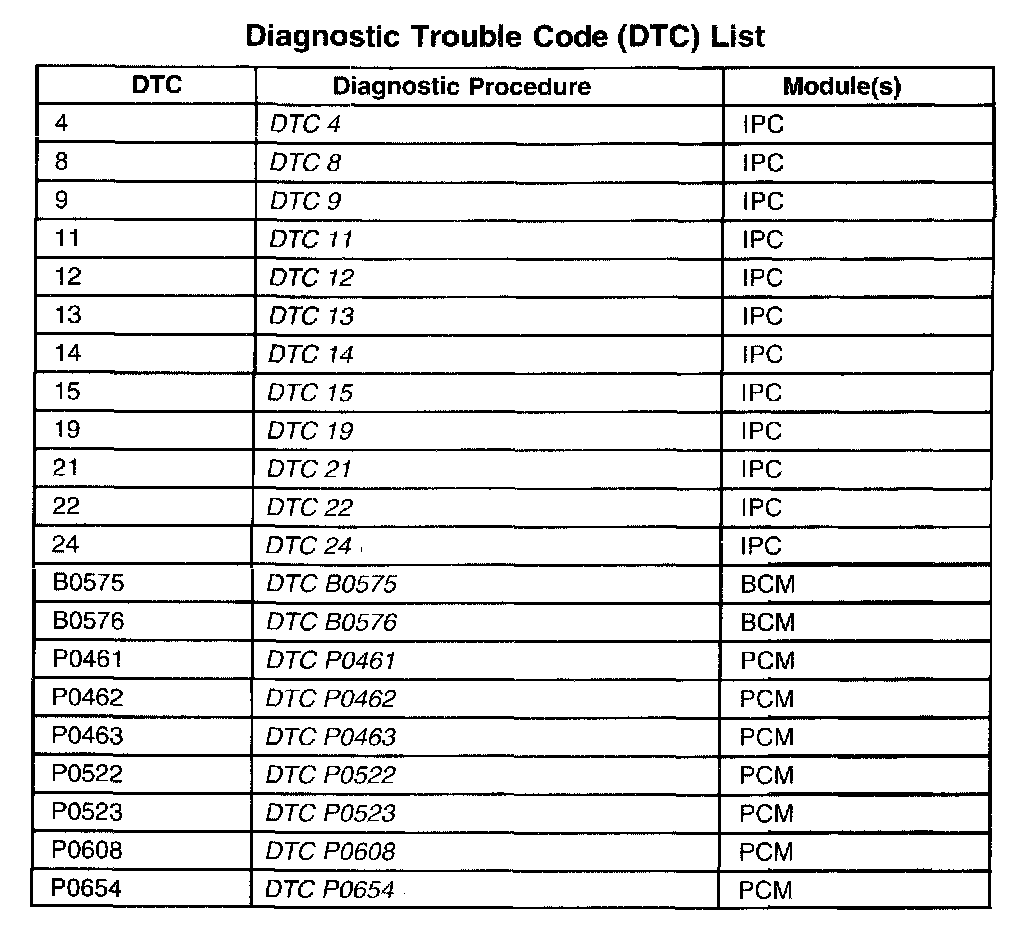 Diagnostic Trouble Code (DTC) List: