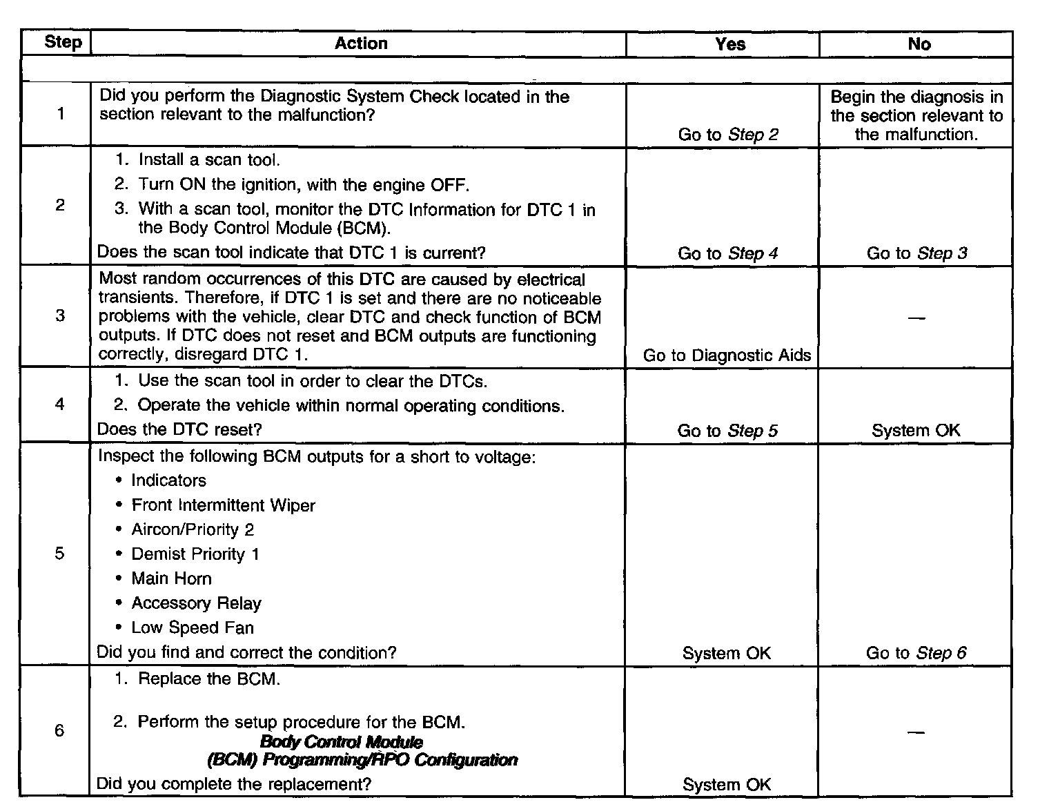 Therefore, if DTC 1 is set and there are no noticeable problems with the vehicle, clear DTC and check function of body control module (BCM) outputs. If DTC does not reset and BCM outputs are functioning correctly, disregard DTC 1.