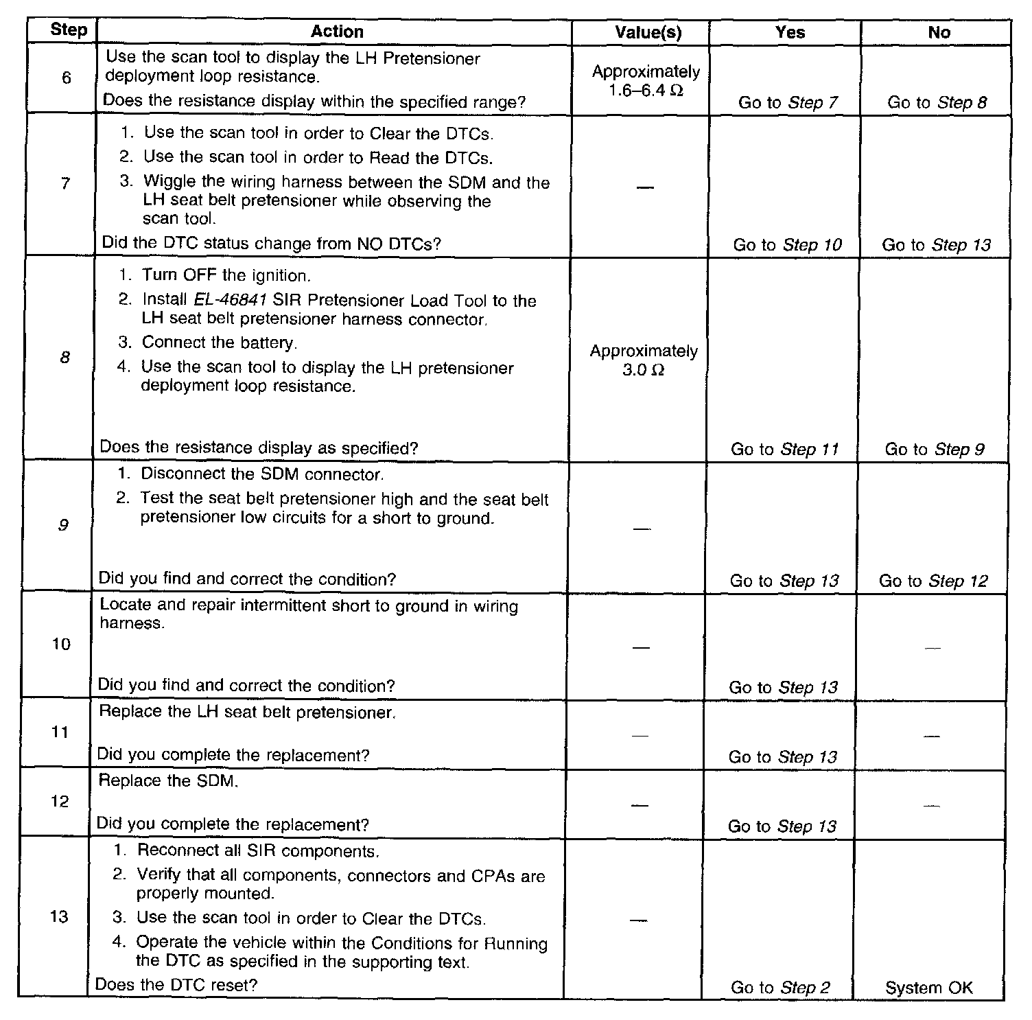 9. Test the seat belt pretensioner high and the seat belt pretensioner low circuits for a short to ground.