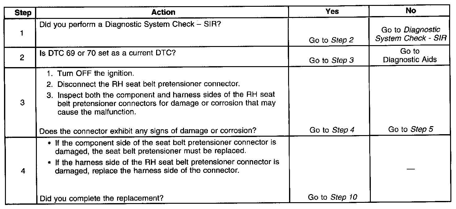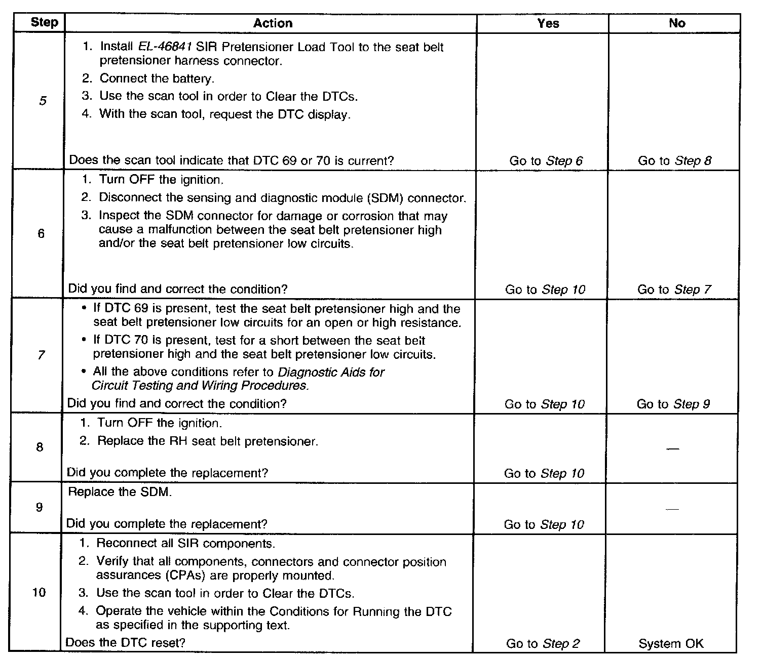 7. If DTC 69 is present, test the seat belt pretensioner high and the seat belt pretensioner low circuits for an open or high resistance. If DTC 70 is present, test for a short between the seat belt pretensioner high and the seat belt pretensioner low circuits.