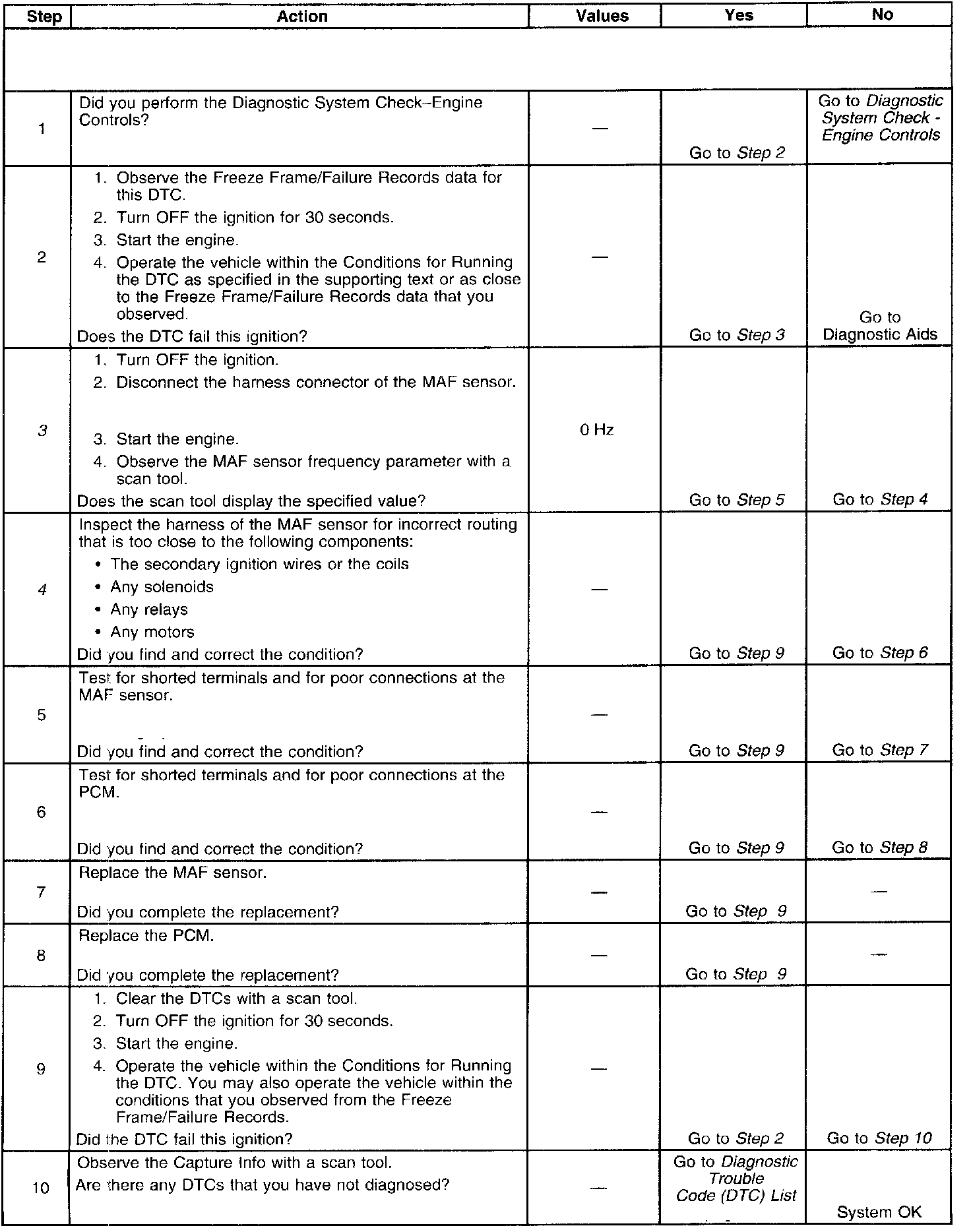 The mass air flow (MAF) sensor is an air flow meter that measures the amount of air entering the engine. The powertrain control module (PCM) uses the MAF sensor frequency signal in order to provide the correct fuel delivery for a wide range of engine speeds and loads. A small quantity of air entering the engine indicates a deceleration or idle. A large quantity of air entering the engine indicates an acceleration or high load condition. The MAF sensor has an ignition 1 voltage circuit, a ground circuit, and a signal circuit. The PCM applies a voltage to the sensor on the signal circuit. The sensor uses the voltage in order to produce a frequency based on inlet air flow through the sensor bore. The frequency varies within a range of around 2,000 Hertz at idle to about 11,500 Hertz at maximum engine load. If the PCM detects a frequency signal that is too high, this DTC sets.