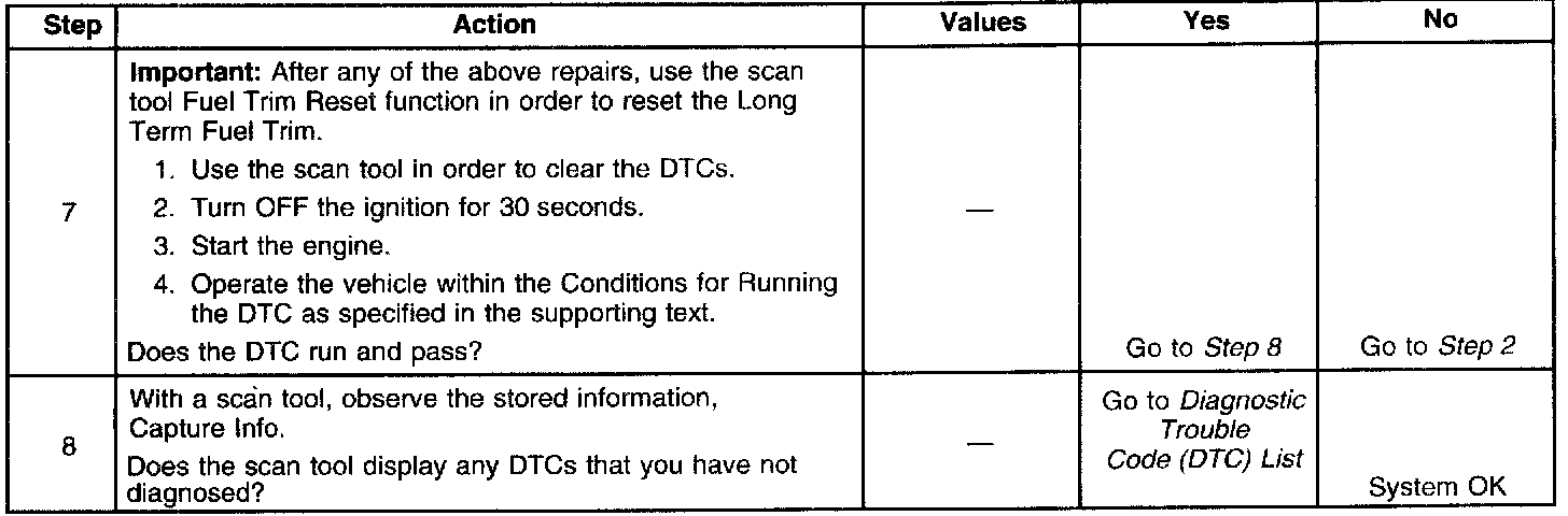 The powertrain control module (PCM) controls the air/fuel metering system in order to provide the best possible combination of driveability, fuel economy, and emission control. Fuel delivery is controlled differently during open and closed loop. During open loop, the PCM determines fuel delivery based on sensor signals without oxygen sensor input. During closed loop, the oxygen sensor inputs are added and used by the PCM to calculate short and long term fuel trim fuel delivery adjustments. If the oxygen sensors indicate a lean condition, the fuel trim values will be above 0 percent. If the oxygen sensors indicate a rich condition, the fuel trim values will be below 0 percent. Short term fuel trim values change rapidly in response to the heated oxygen sensor (HO2S) voltage signals. Long term fuel trim makes coarse adjustments in order to maintain an air/fuel ratio of 14.7:1. The fuel trim diagnostic will conduct a test to determine if a rich failure actually exists, or if excessive vapor from the evaporative emission (EVAP) canister is causing a rich condition. If the PCM detects an excessively rich condition, this DTC will set. If the PCM detects excessive vapor, then a pass is logged.