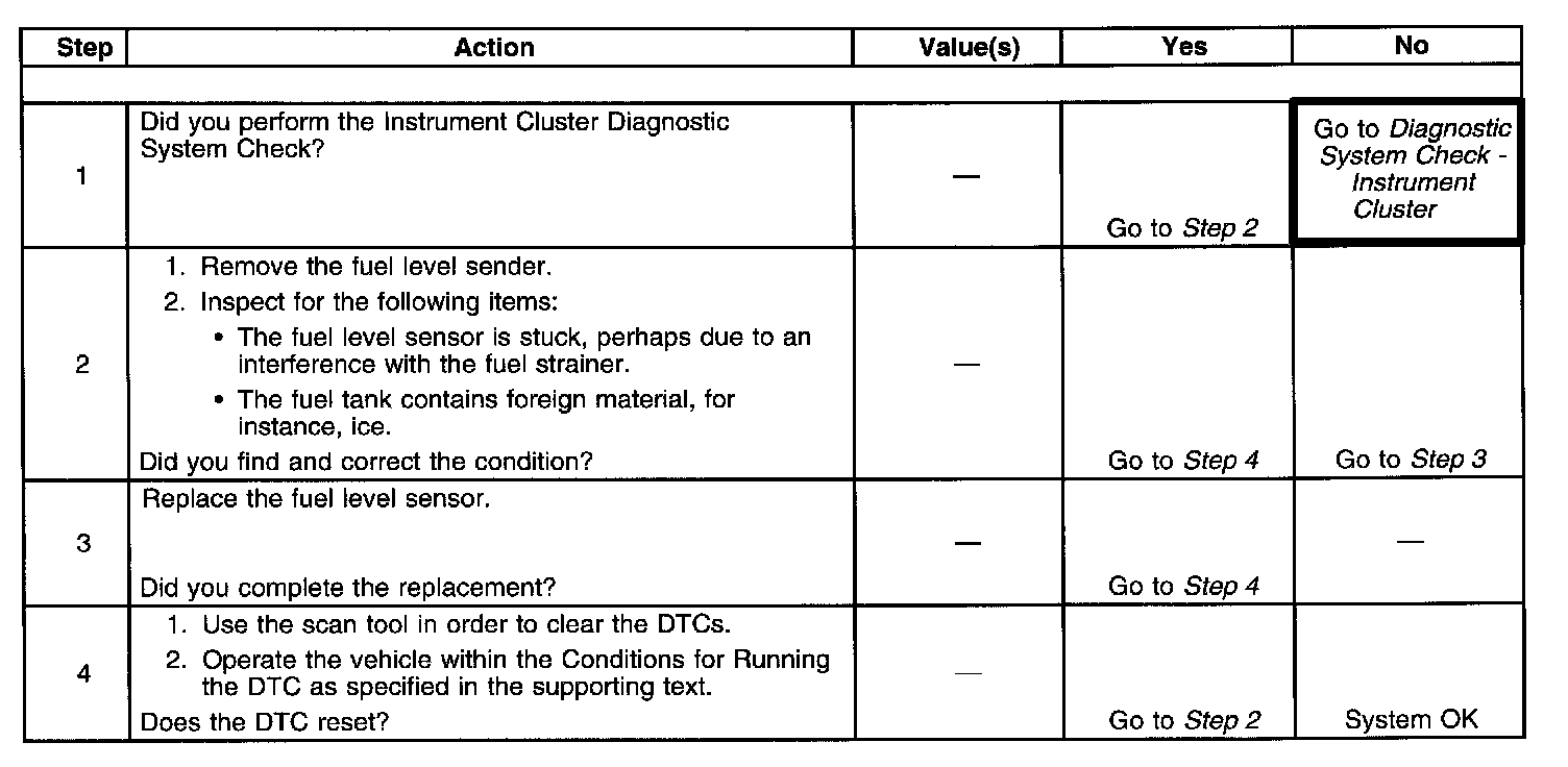 The fuel level sensor measures fuel level changes within the fuel tank and changes resistance based on fuel level. The powertrain control module (PCM) monitors changes in the resistance of the sensor to determine fuel level. When the fuel tank is full, the sensor resistance is high, and the PCM senses high signal voltage. When the fuel tank is empty, the sensor resistance is low, and the PCM senses a low signal voltage. The PCM uses inputs from the fuel level sensor to calculate the total fuel remaining in the fuel tank. This information is then sent to the Instrument via the Class 2 serial data circuit and the powertrain interface module (PIM). When the PCM senses a signal voltage lower than the normal operating range of the sensor the DTC is set.