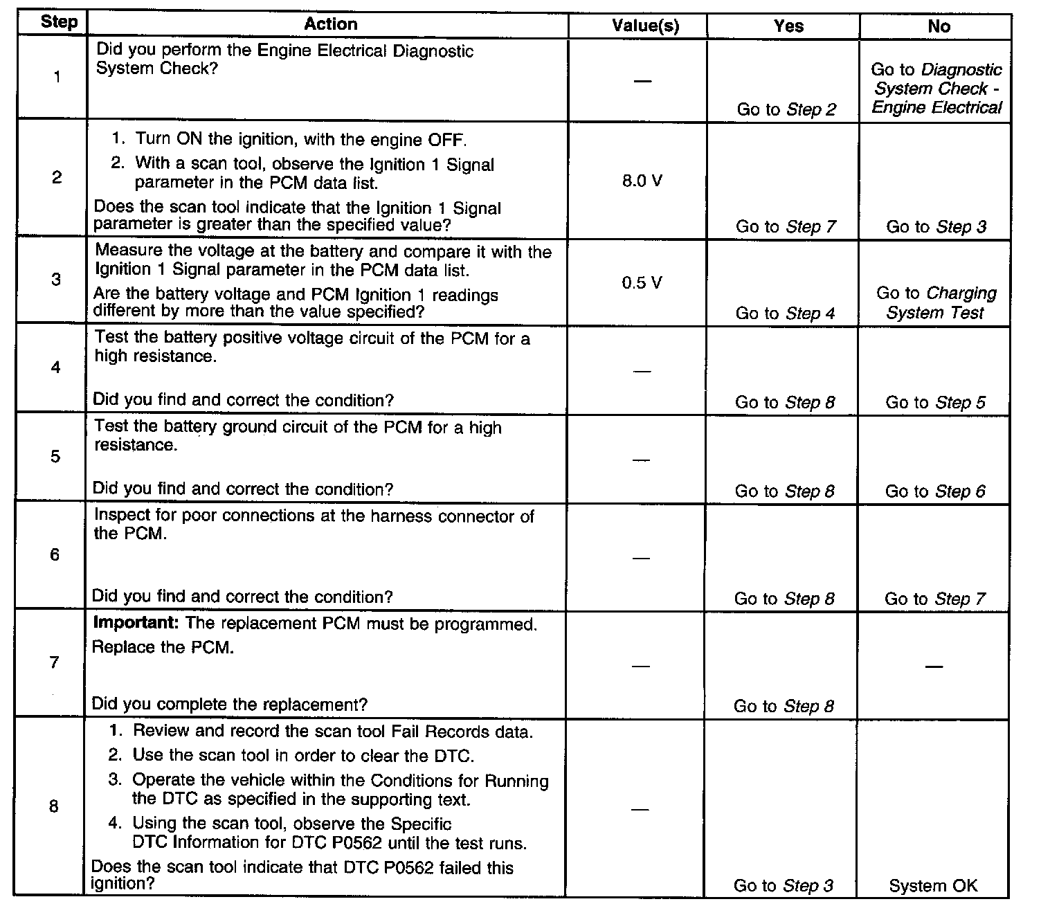 CIRCUIT DESCRIPTIONThe powertrain control module (PCM) continuously monitors the system voltage. The system voltage information is taken from the ignition feed circuit to the PCM. Voltages below 8.0 volts or above 17.1 volts cause improper system operation and/or component damage. The PCM operates in a default mode if a PCM voltage DTC sets. If the system voltage is low, the PCM raises the idle speed to increase the generator output. The PCM disables most outputs to protect the hardware if the system voltage is high. Tech 2 will not display data if system voltage is outside this range. Use a DMM to monitor the system voltage to check to see if the fault is currently present. DTC P0562 is a type 'C' DTC.
