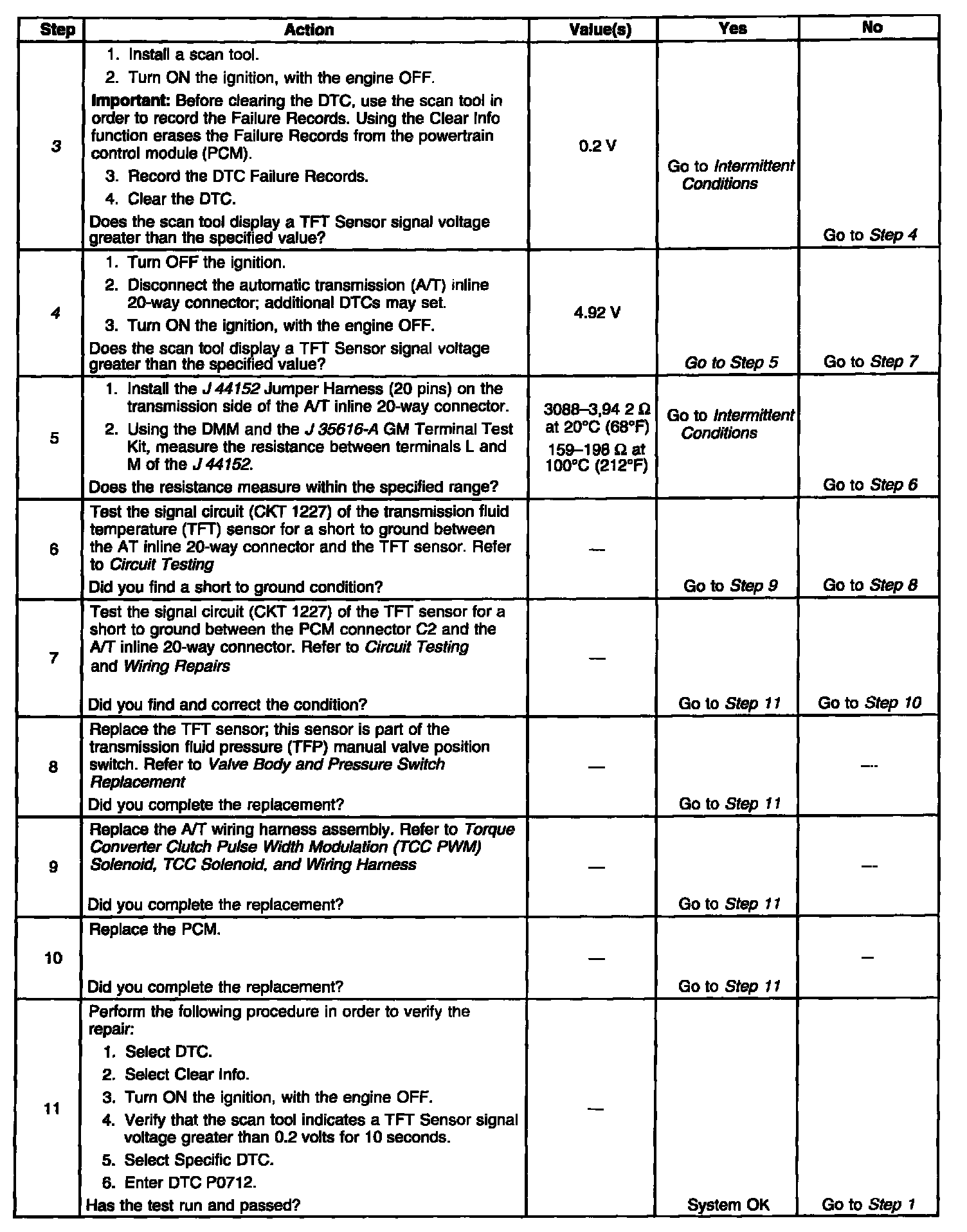 When the PCM detects a continuous short to ground in the TFT signal circuit or in the TFT sensor, then DTC P0712 sets. DTC P0712 is a type C DTC.