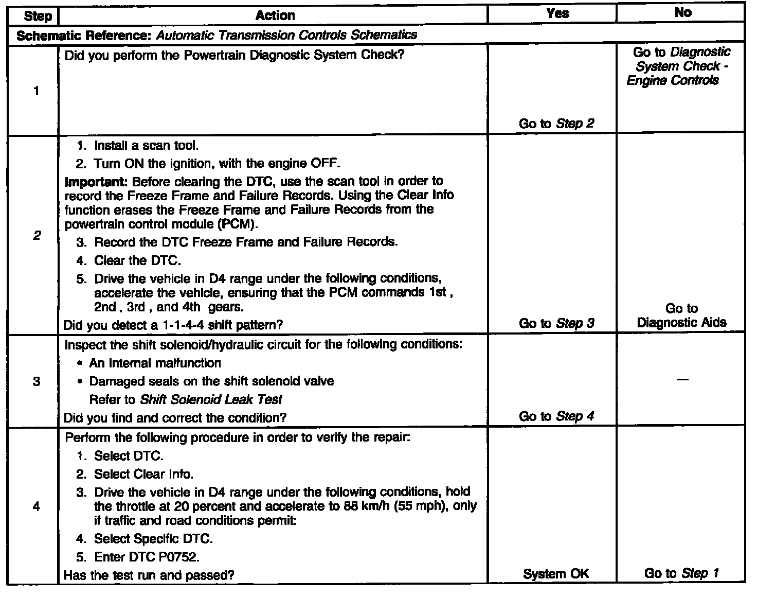 When the powertrain control module (PCM) detects a 1-1-4-4 shift pattern, then DTC P0752 sets. DTC P0752 is a type B DTC.