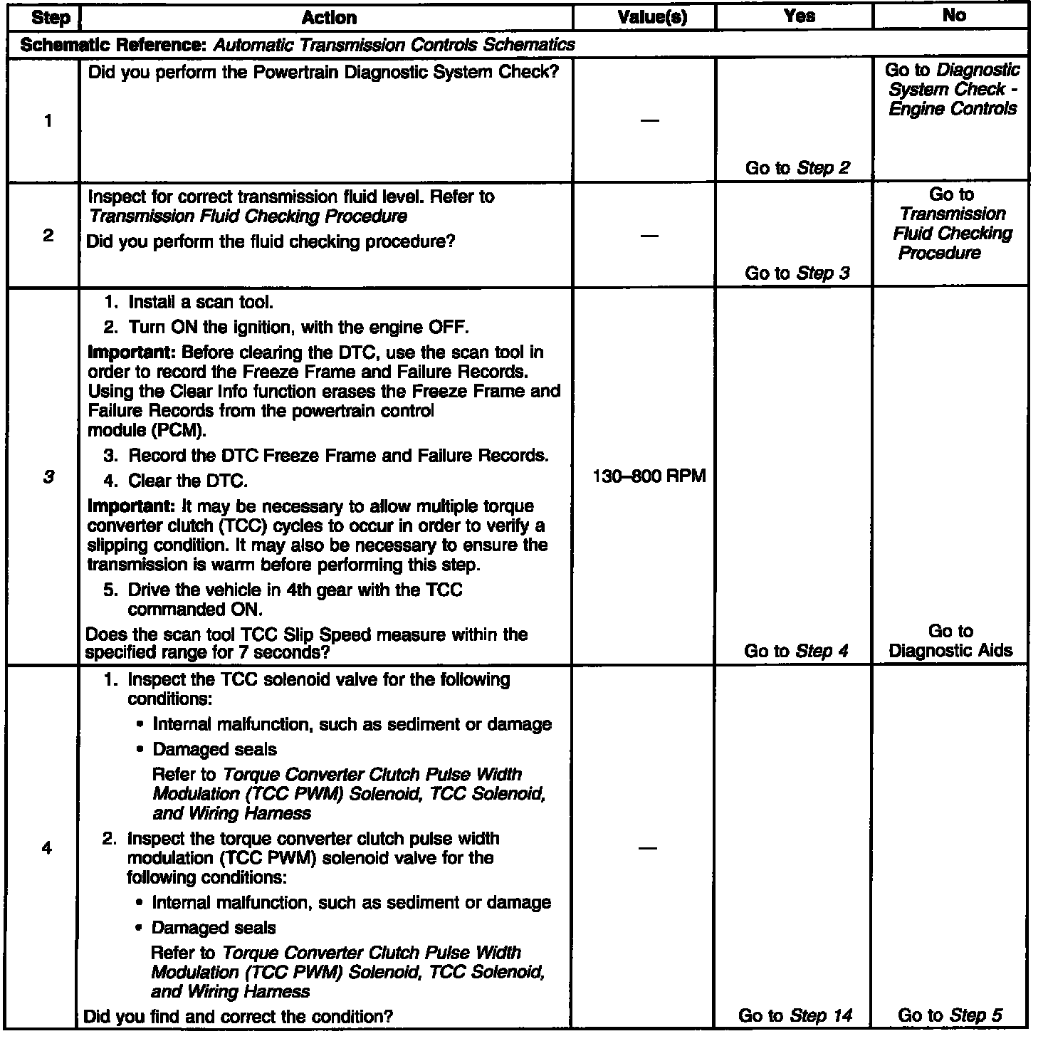 If Condition 1 is met and the TCC slip speed is 130-800 RPM for 7 seconds, then the PCM will command the TCC Off for 1.5 seconds.
