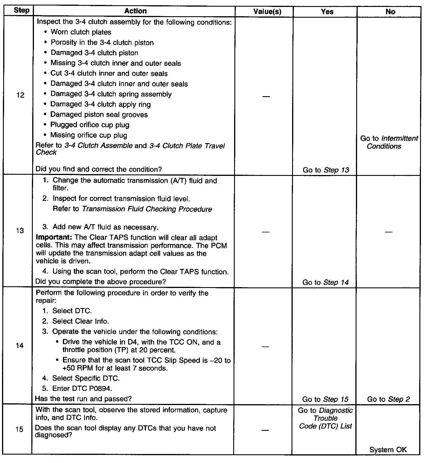 When the PCM detects excessive TCC slip when the TCC should be engaged, then DTC P0894 sets. DTC P0894 is a type B DTC.