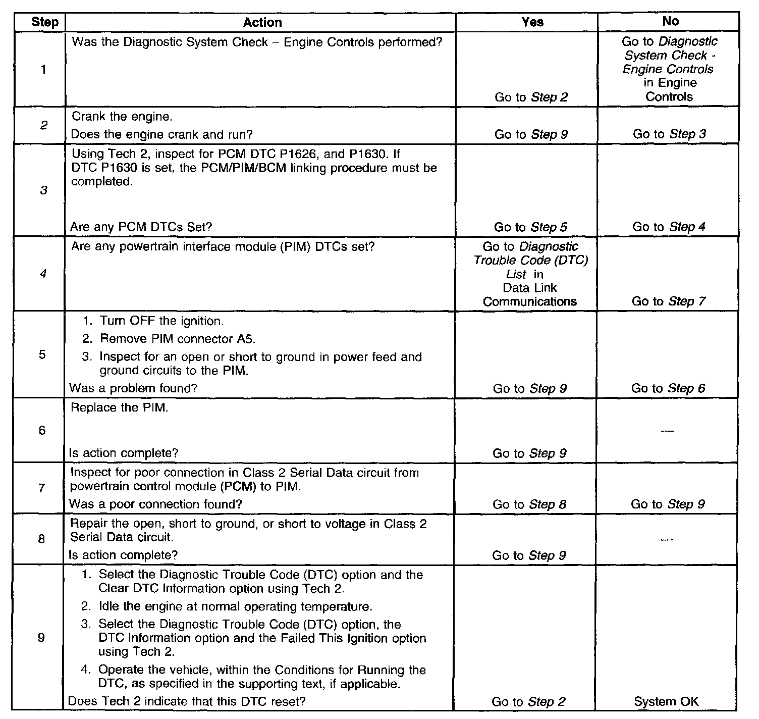 2. An engine that does not start and a DTC P1626 that is set, indicates that there is a Class 2 Serial Data circuit problem. There may be several PIM DTCs set if the Class 21 Serial Data circuit has malfunctioned.