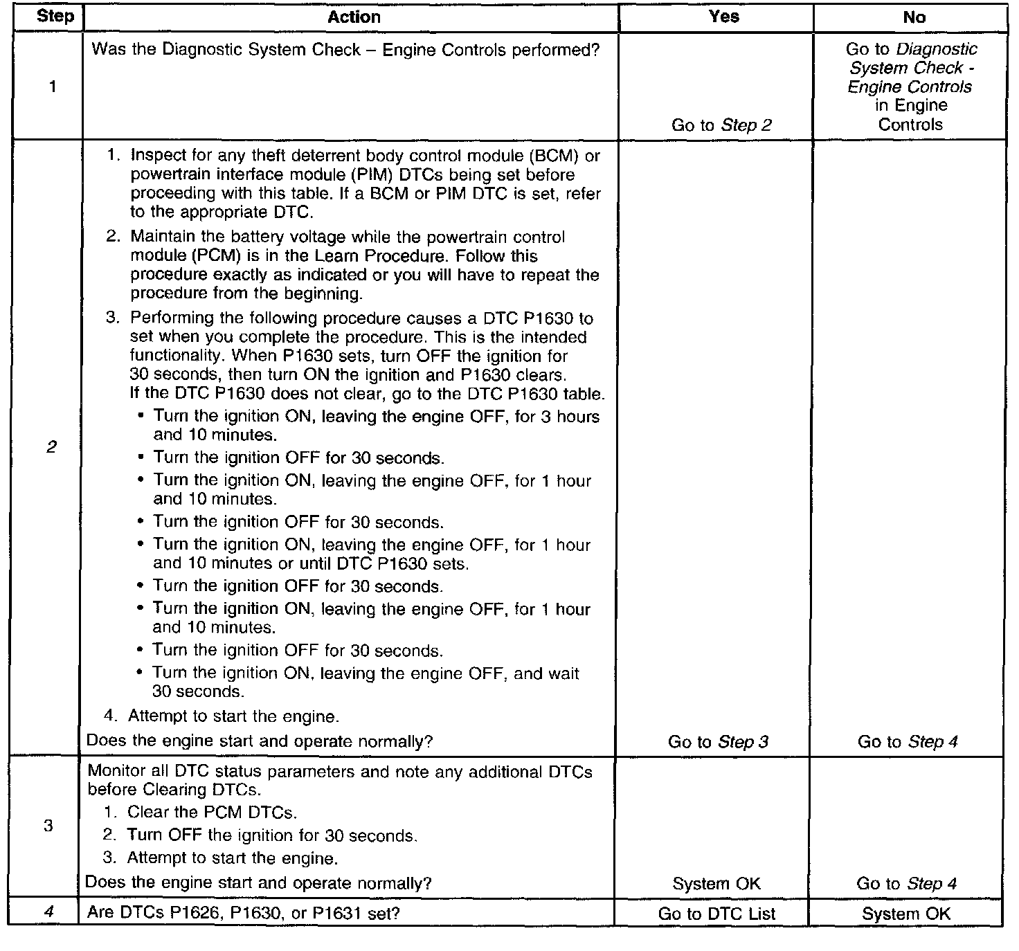 The PCM in learn mode is a DTC for the personnel at the assembly plant, retailer, or outside garage as an indication that the system enables the learn mode. This means the PCM is now ready to learn a new password from the PIM while in the learn mode. When this occurs, the vehicle is vulnerable to vehicle theft. If using Tech 2 and TIS for password linking, refer to Body Control Module (BCM) Programming/RPO Configuration in Body Control System for the linking procedure. This Tech 2 operation will take approximately 2 minutes to perform. If no Tech 2 and TIS is available, the following DTC P1631 diagnostic table must be followed.