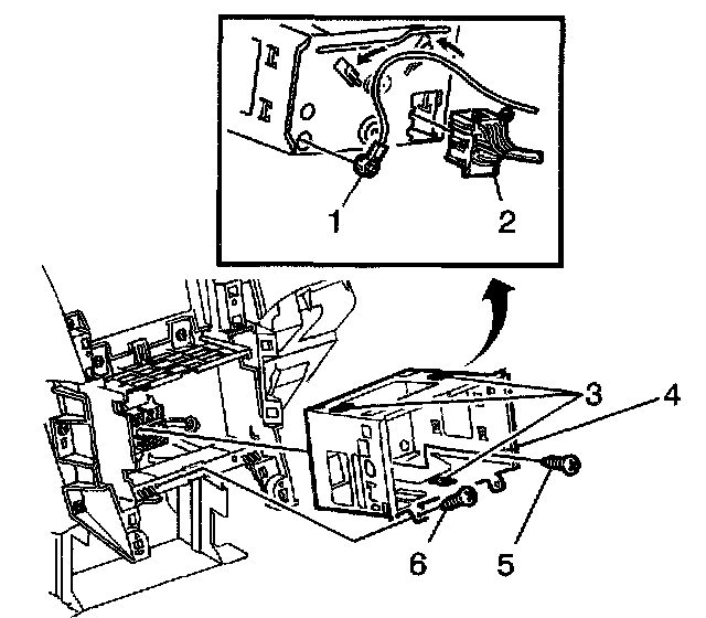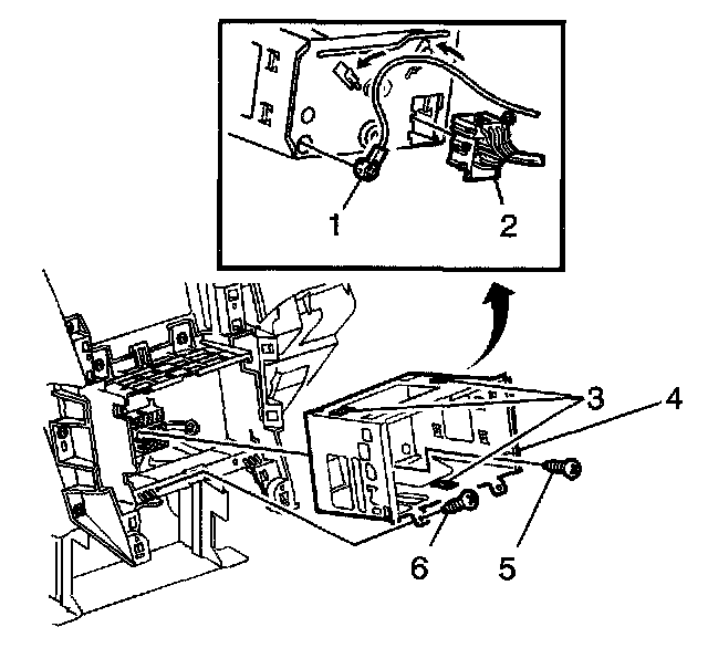 4. Remove the two screws (6) attaching the front edge of the radio housing (4) to the radio bracket assembly.