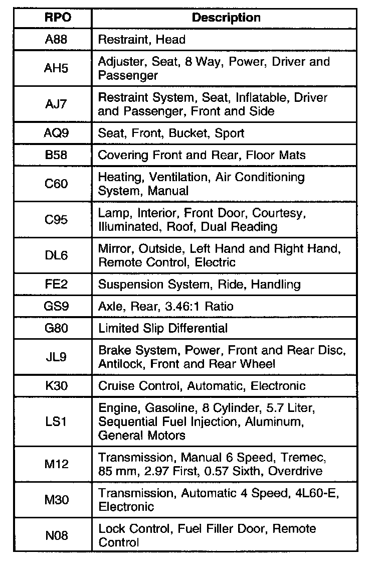 The production and process codes provide the description of the Regular Production Options (RPOs) used on the GTO. The RPO list is printed on the Service Parts Identification Label. The following is a list of the RPO abbreviations and the description of each: