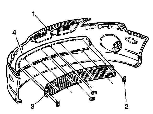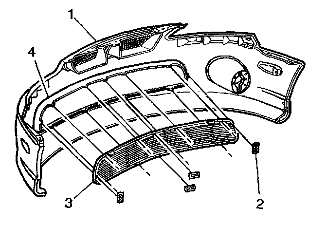 3. Using a flat-bladed tool, remove the 4 rectangular speed nuts (2) attaching the lower fascia grille (3) to the front bumper fascia (1).